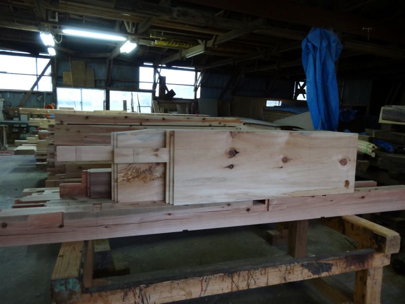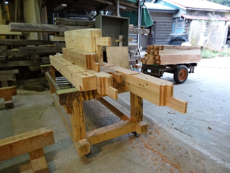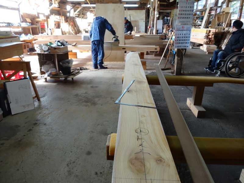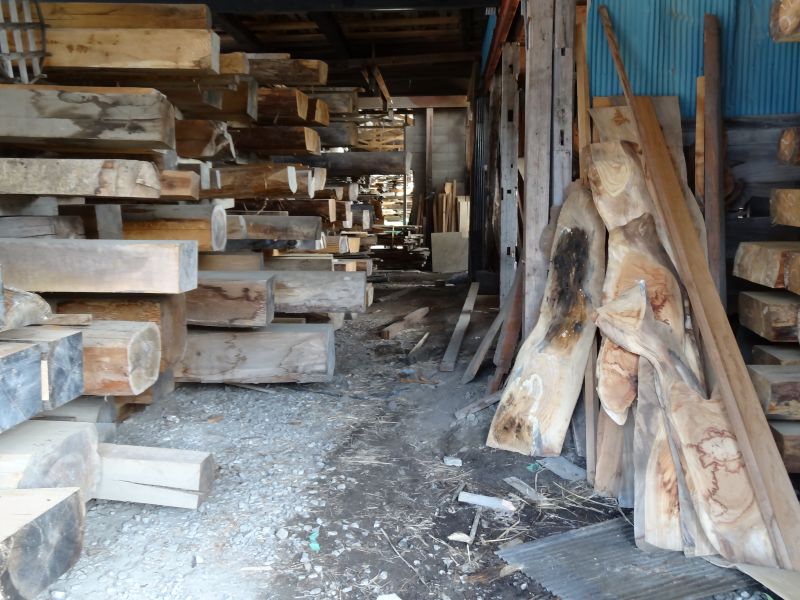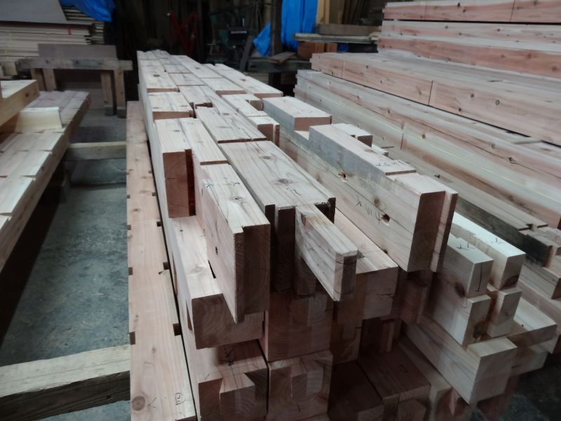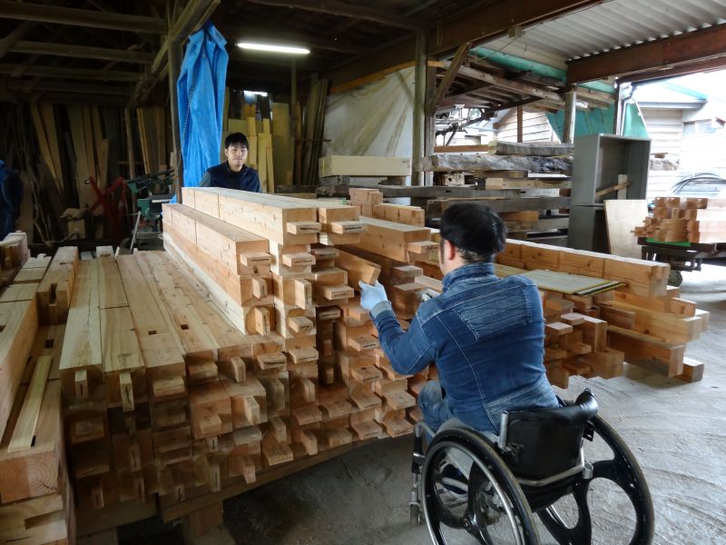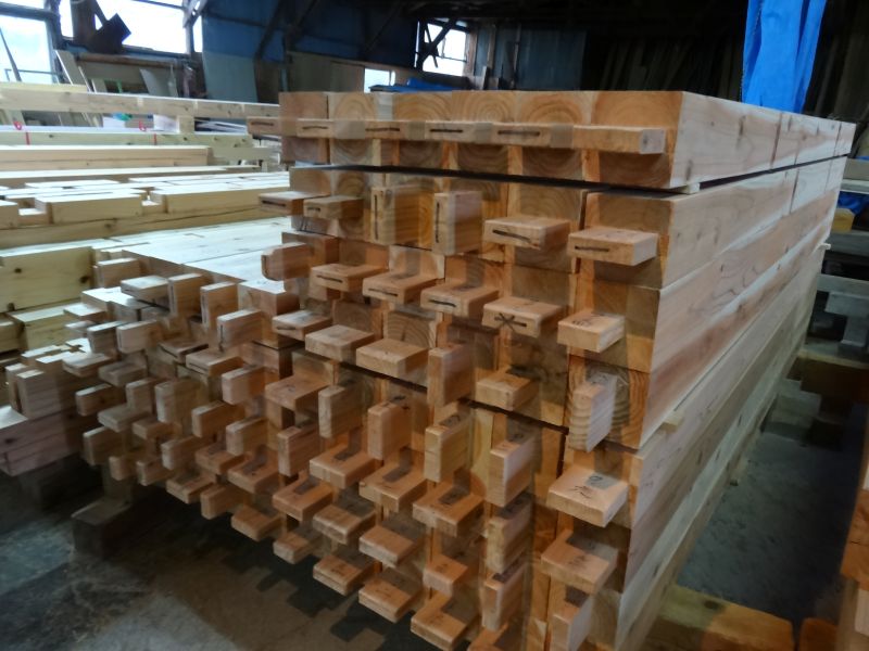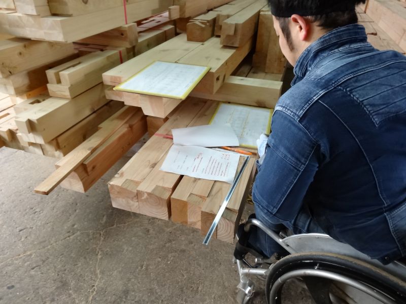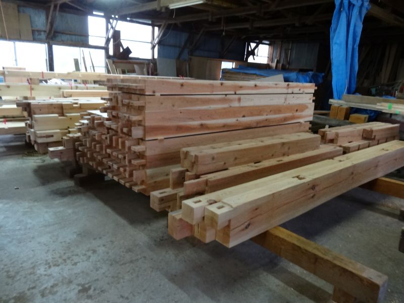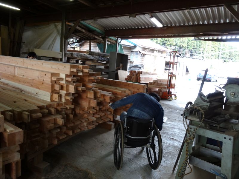 秋空の下、リハビリを兼ねて歩数計を気にして一人歩くと、場内に積み置かれた在庫の大黒柱や太い梁に雑木の板がとてもたくさん確認できます。そして、材料が片付けられて綺麗になって寂しい場内では車椅子大工が一人、建て方材に使う、楔造りをしていました。栗の柱や土台など刻みの際にとり置いて、こうして細かくしながら作ります。端材と言えば端材でも使い切れば必要材です。