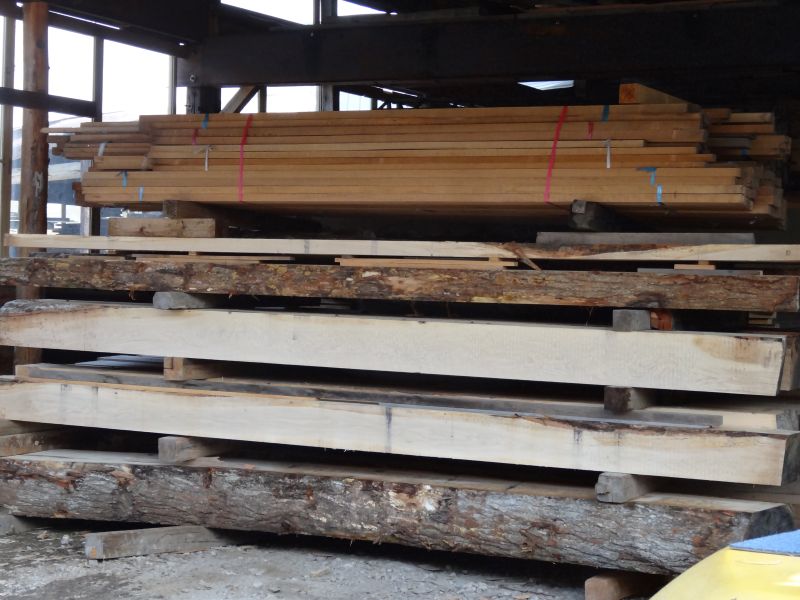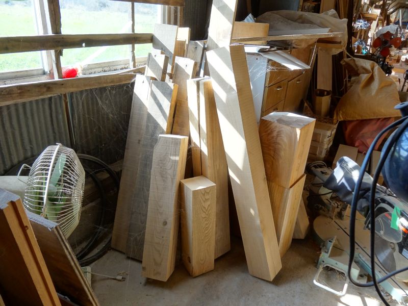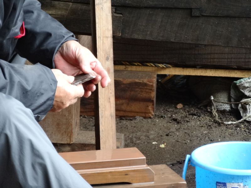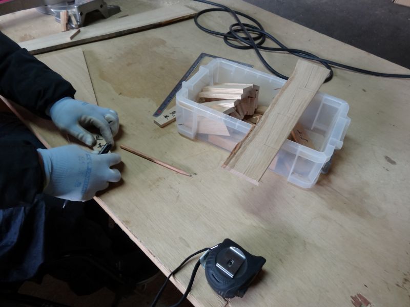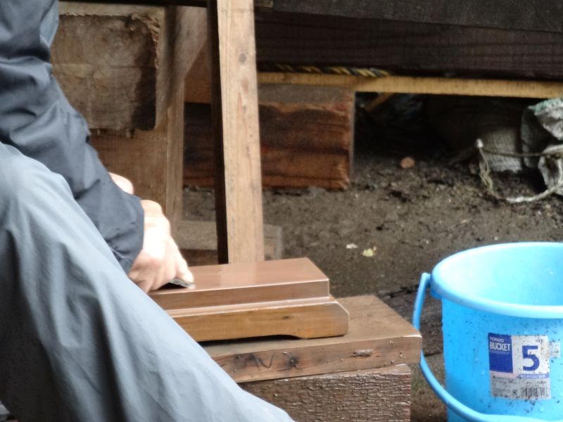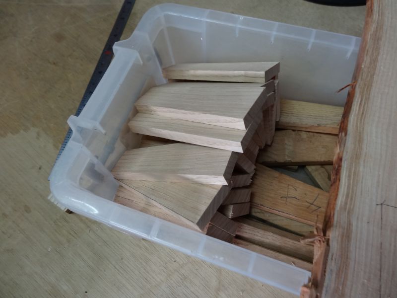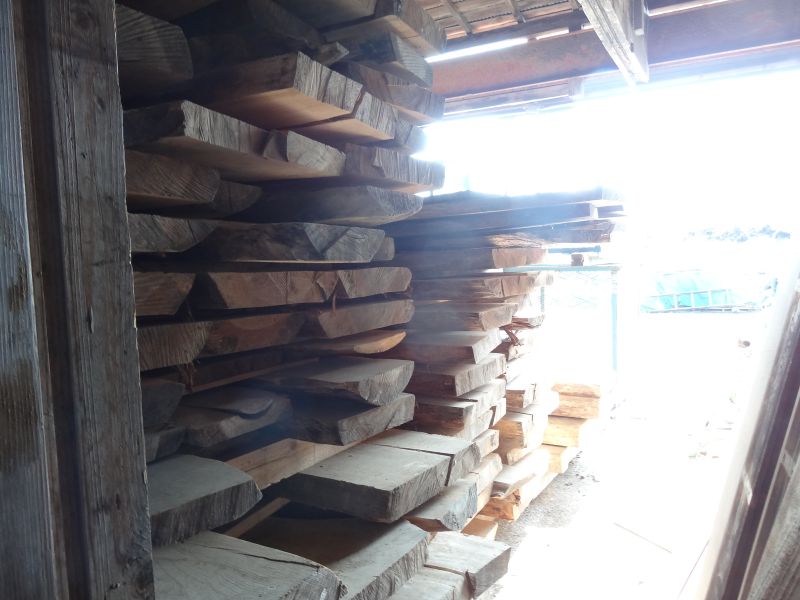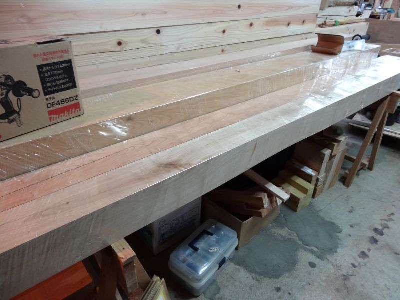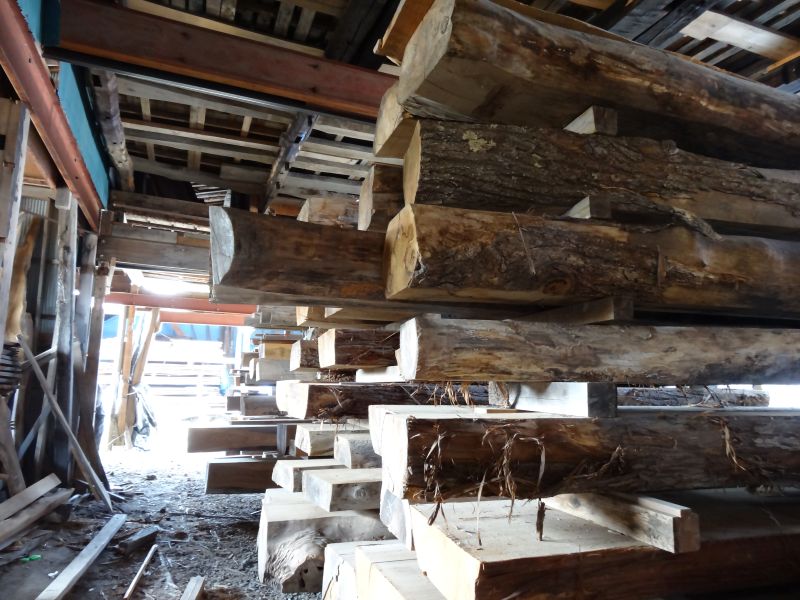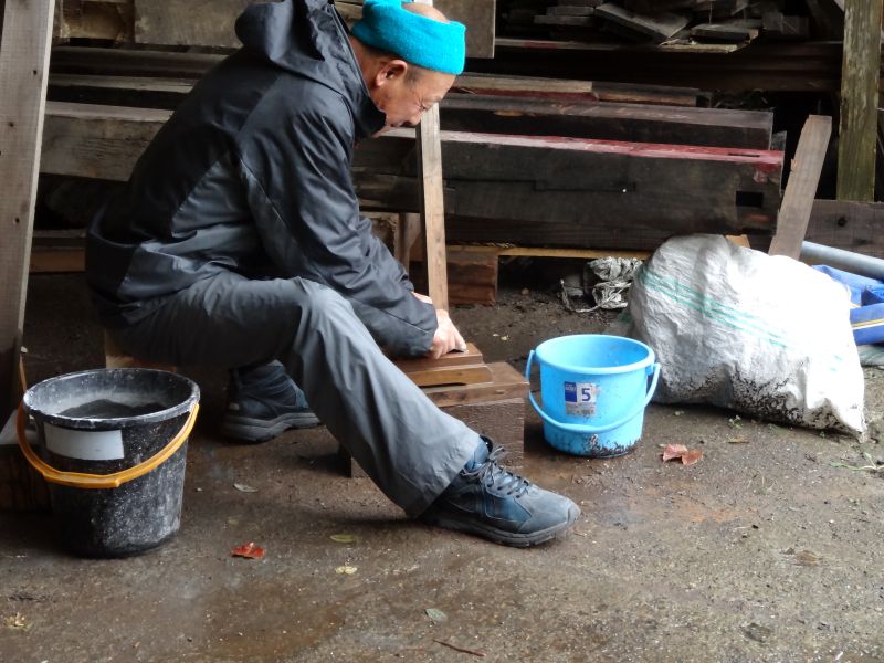 秋空の下、リハビリを兼ねて歩数計を気にして一人歩くと、場内に積み置かれた在庫の大黒柱や太い梁に雑木の板がとてもたくさん確認できます。そして、材料が片付けられて綺麗になって寂しい場内では車椅子大工が一人、建て方材に使う、楔造りをしていました。栗の柱や土台など刻みの際にとり置いて、こうして細かくしながら作ります。端材と言えば端材でも使い切れば必要材です。