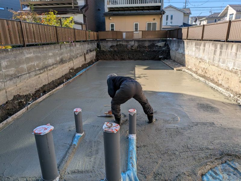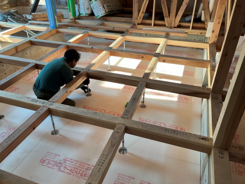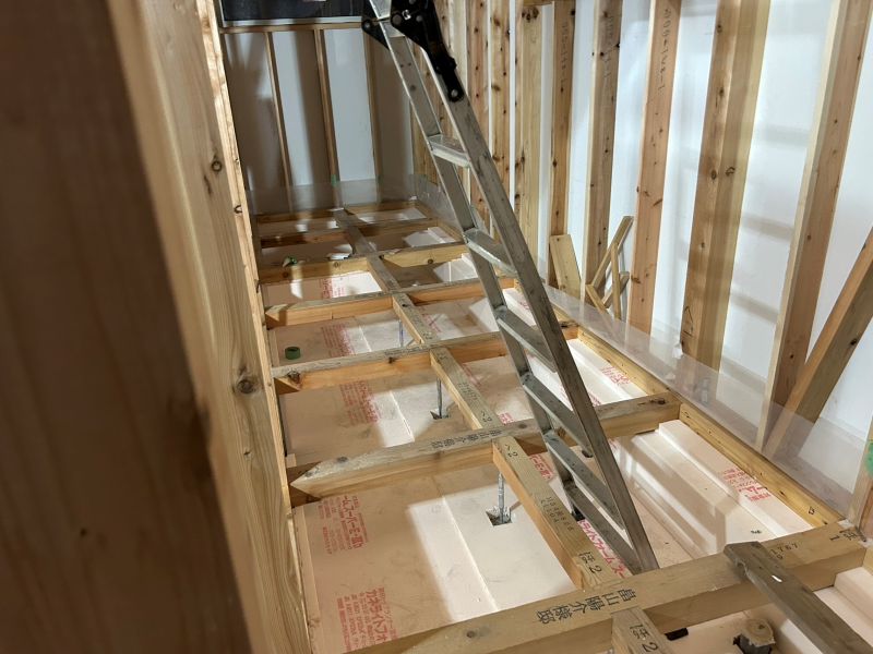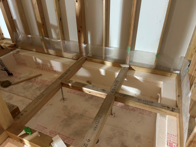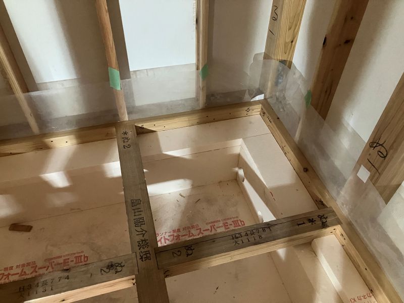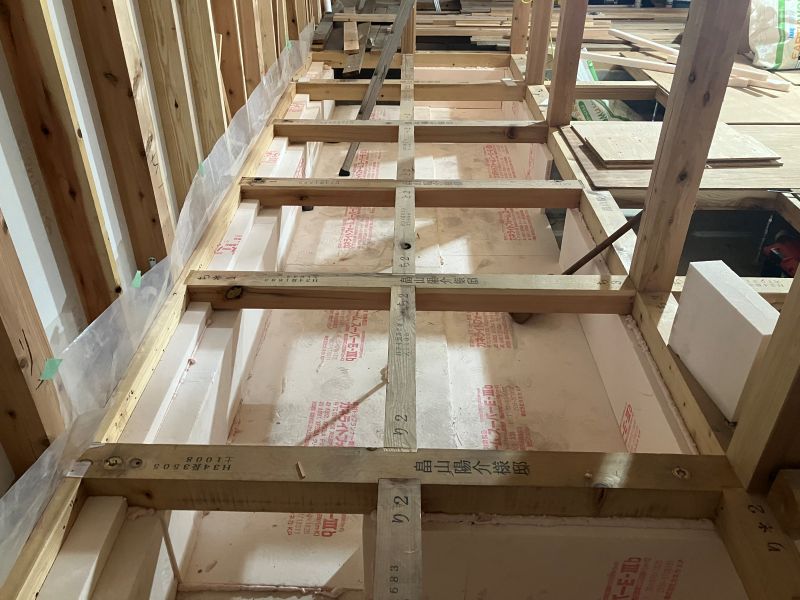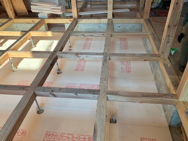 城西町の新築工事現場では、床下の断熱工事が進んでいます。土間部は外周部周りが50mm土間全面30mm厚で敷き込み、立ち上がりは100mm2重張りで、床下の冷気を抑えます。