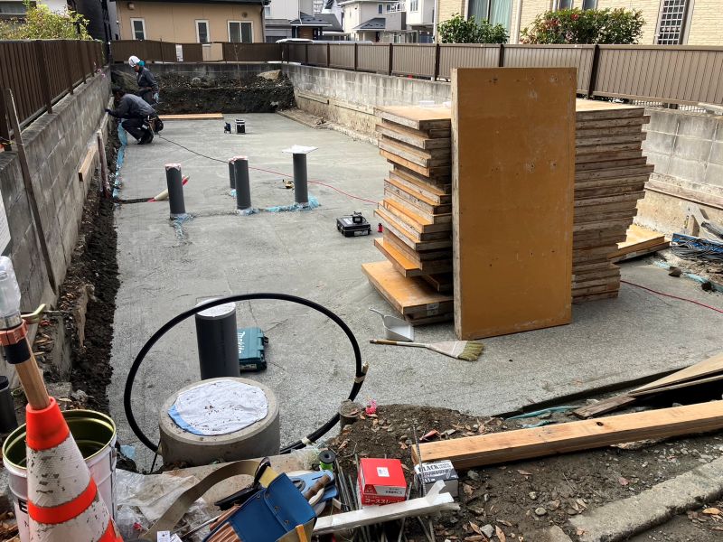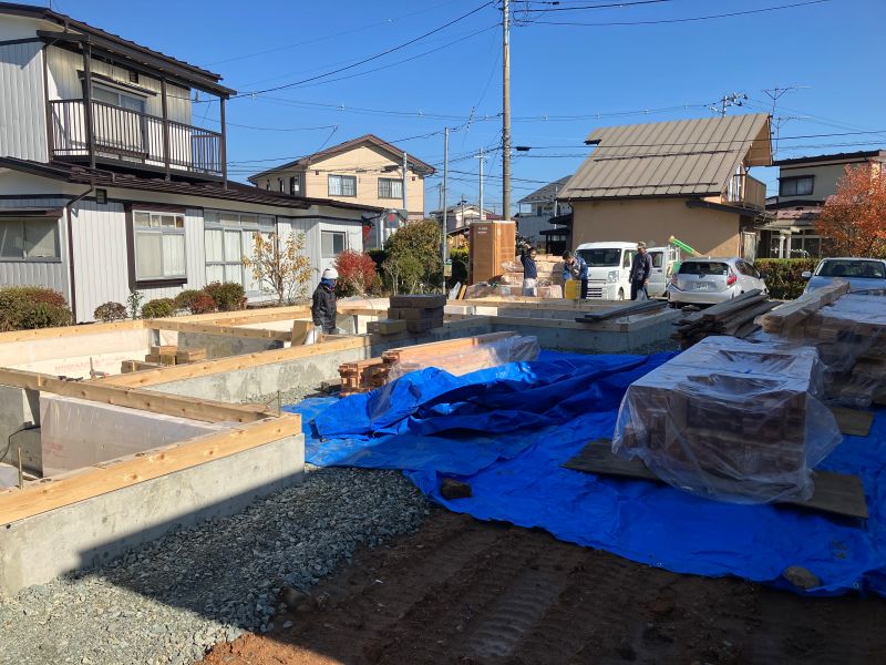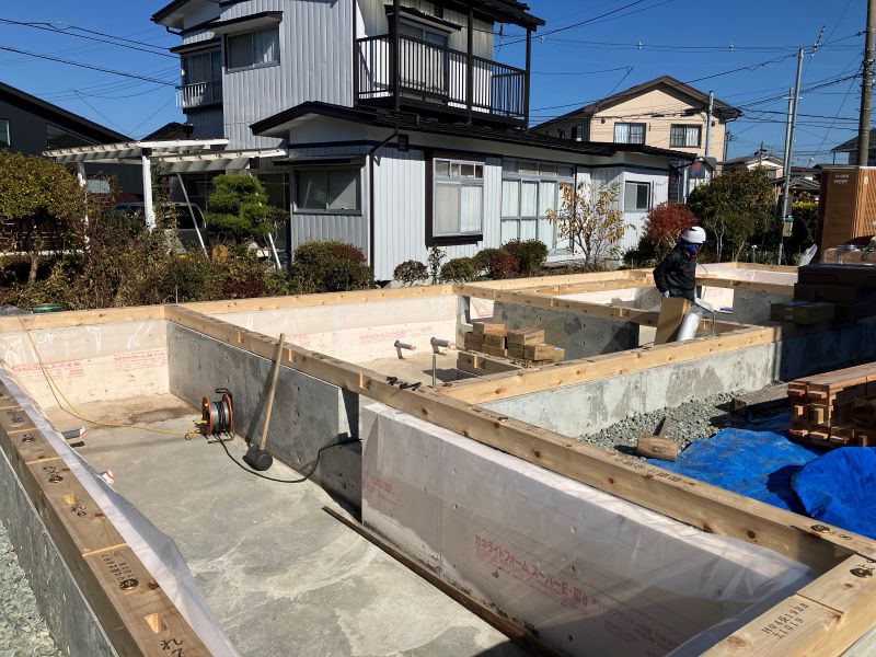 城西町の新築工事は土間断熱が大方となり、西青山の新築工事は土台を敷き込み建て方準備が出来ました。宮古の塀工事も出来てきました。鉈屋町の新築基礎工事は捨てコン後の墨出しが進んで型枠の取り付け準備完了です。鉈屋町の大改修現場の方は古材の梁仕上げが進んでいます。