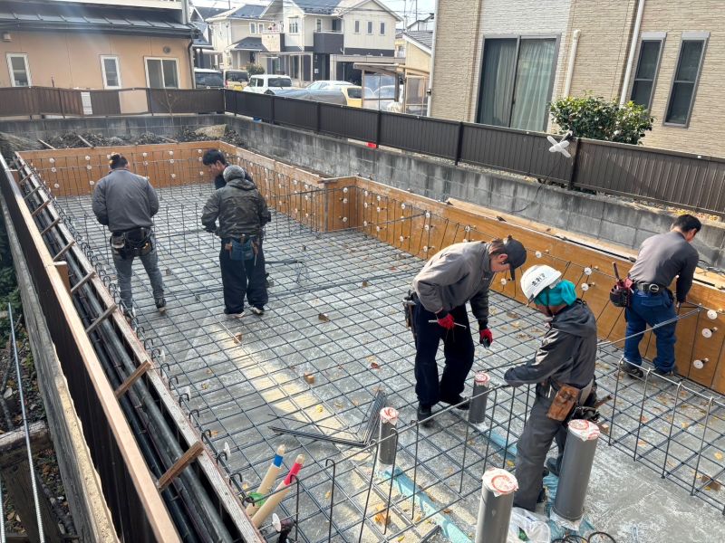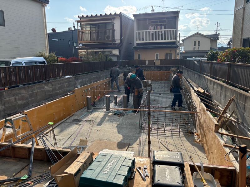 鉈屋町の新築工事現場の基礎は、基礎職と大工職人も一緒に基礎配筋をしていました。人通口の開口補強配筋も入り、配管スリーブも取り付けられて基礎枠も進める事が出来ます。写真内の大勢の職人はみんな当社の社員職人です。べた基礎の地反力曲げモーメントは、内部の方が大きく、中央部が一番大きいので、中央の欠損を出来るだけ避けて、人通口を設けています。主筋もダブルで入るので、計算上より2倍強くなりますね。