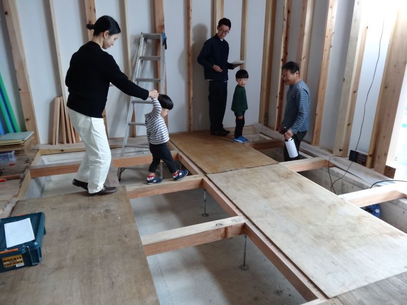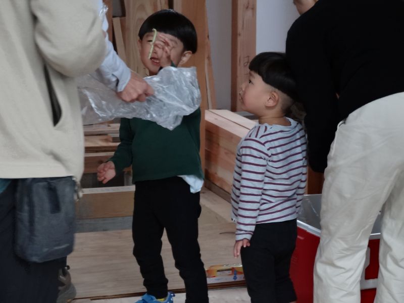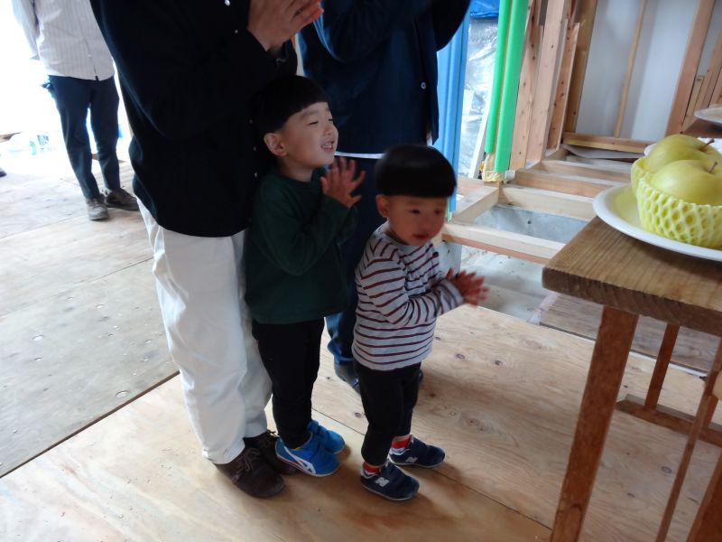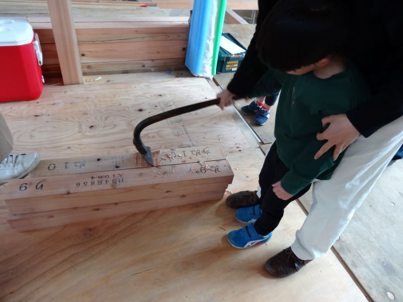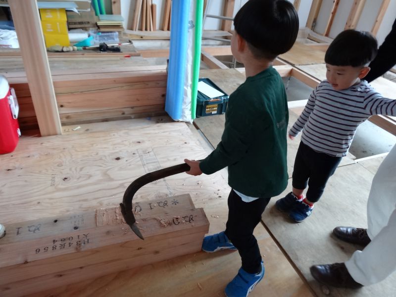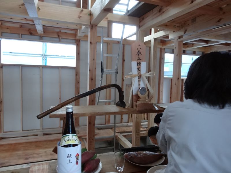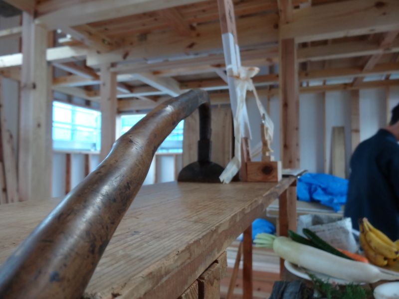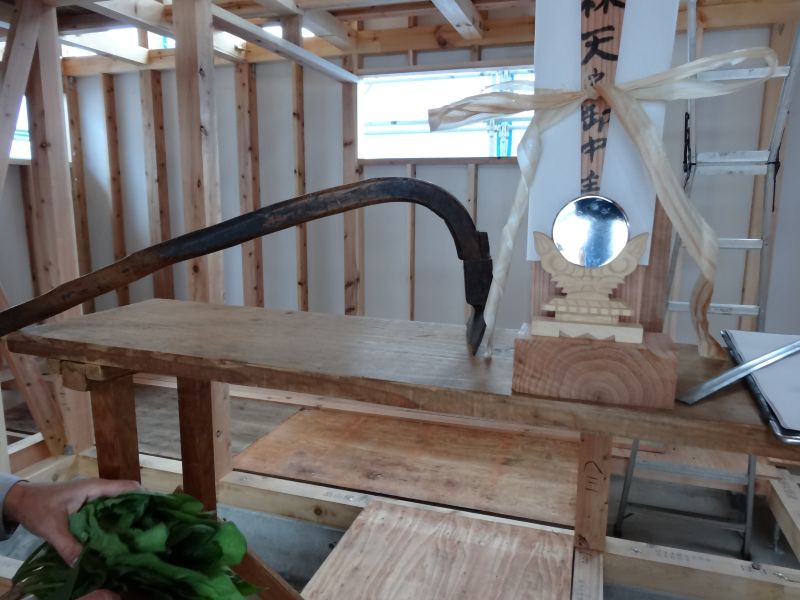 城西町の新築現場にて、上棟式を執り行わせていただきました。祝詞は大工に1400年以上の長きに伝わる内容でしたので、大工道具も同様の長き伝統のチョウナを捧げて、お施主様ご家族にもその殴りの技もご体験いただきました。
