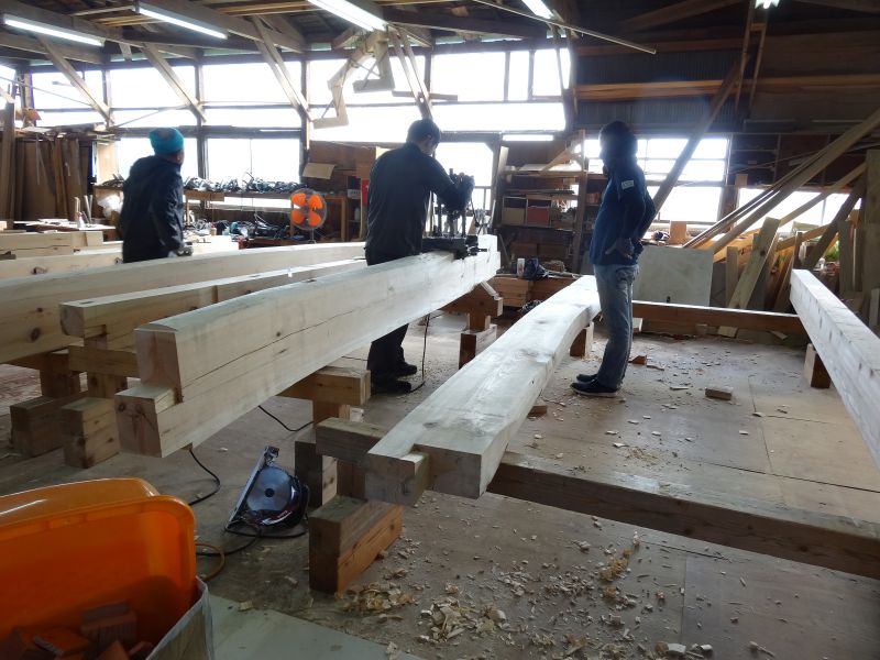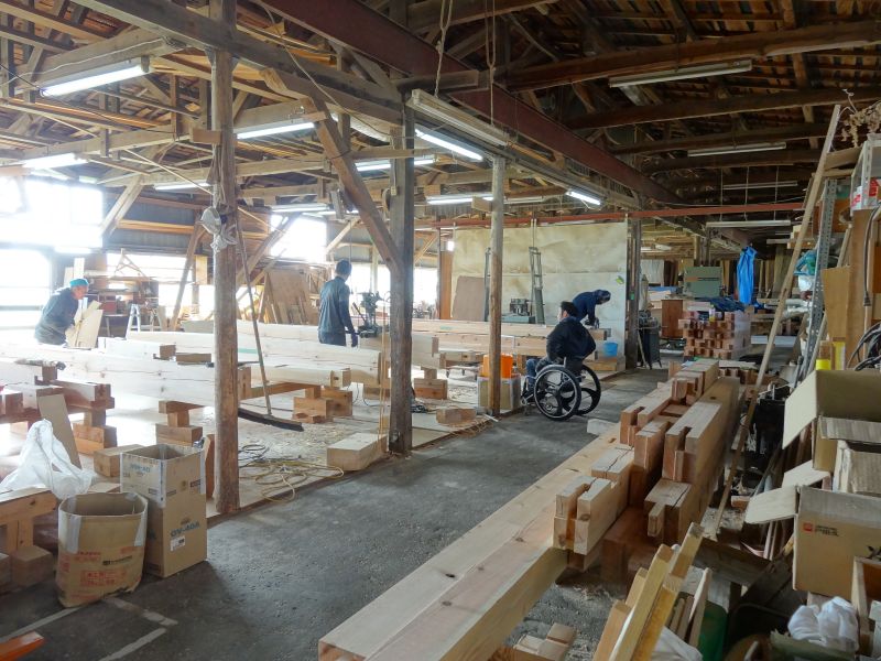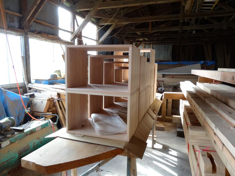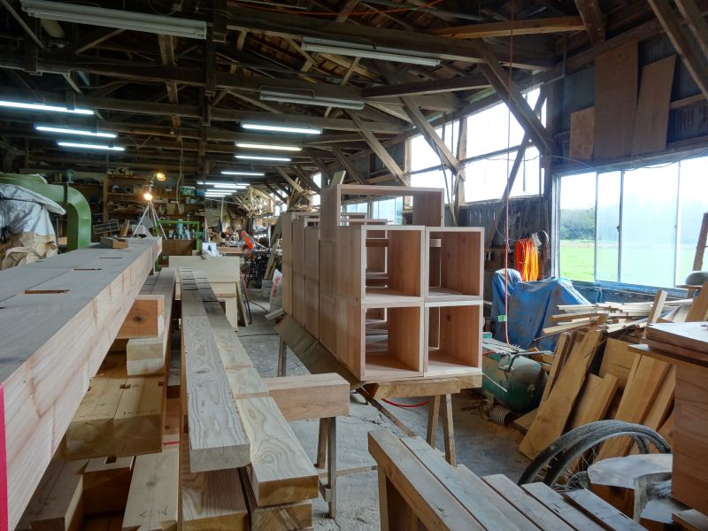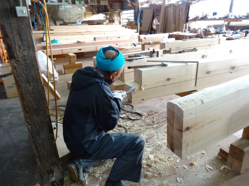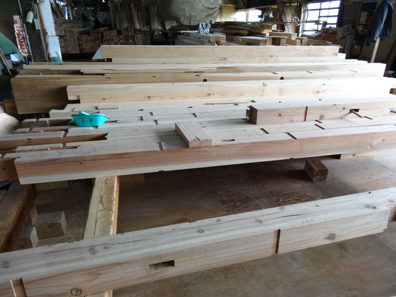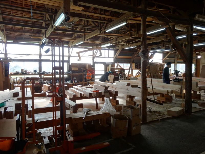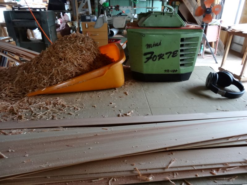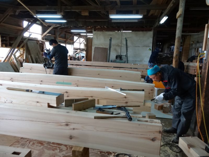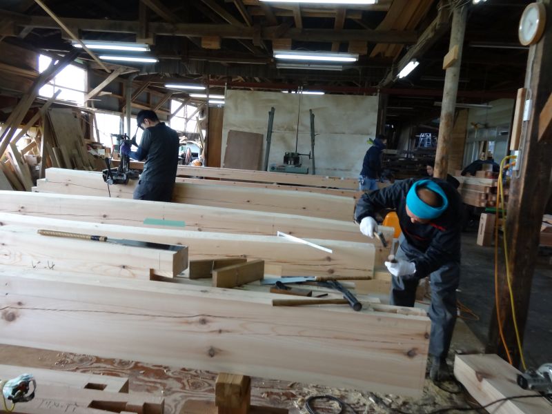 昨日の作業場の光景です。たくさんの箱造りと鉈家町の新築工事の手刻みが進んでいて、木の香りが充満して、手道具を叩く音が響くいいかン時の場内です。