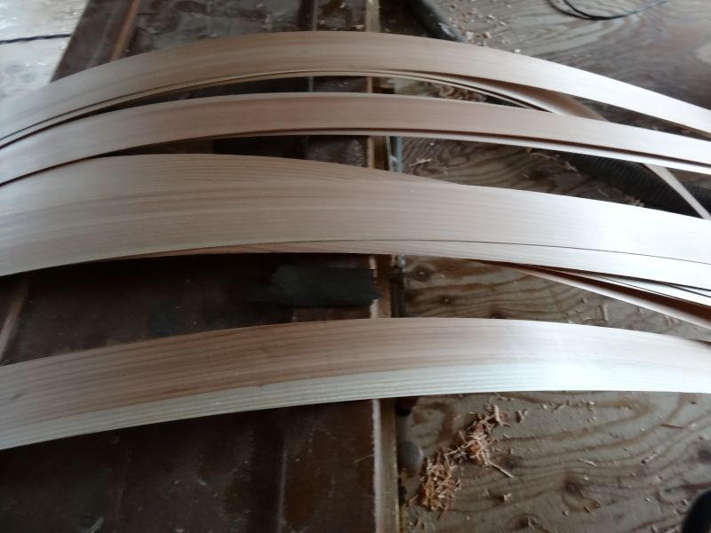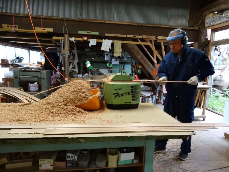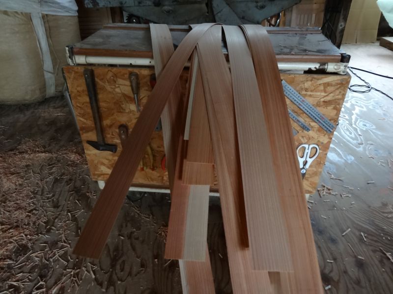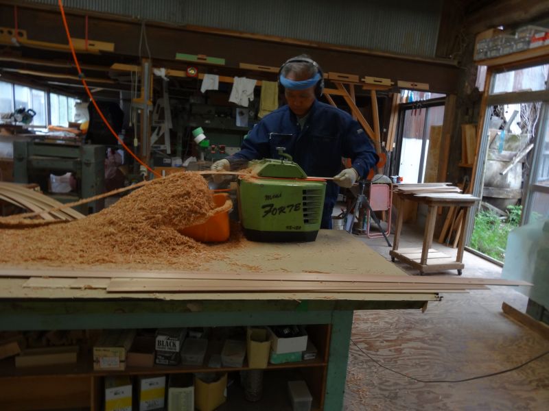 厚さ1ミリの柾板を作っています。鉈家の改修現場の天井板が柾葺きで見えて痛んでいるので、その補修用です。100年前の建物を見てまねて現代に蘇る1mm厚の柾板です。