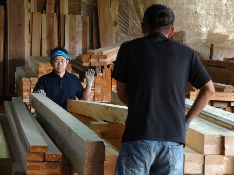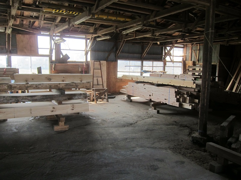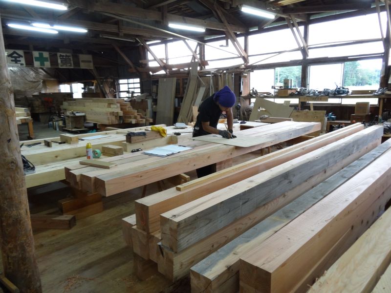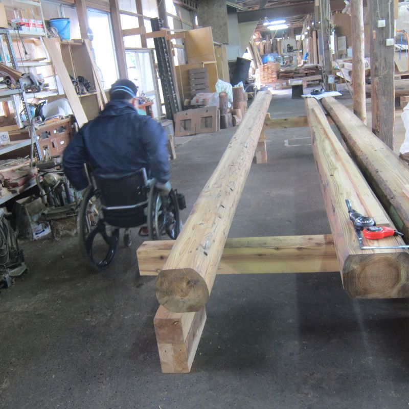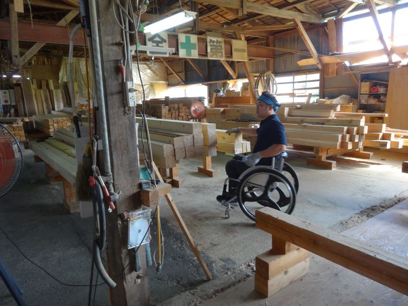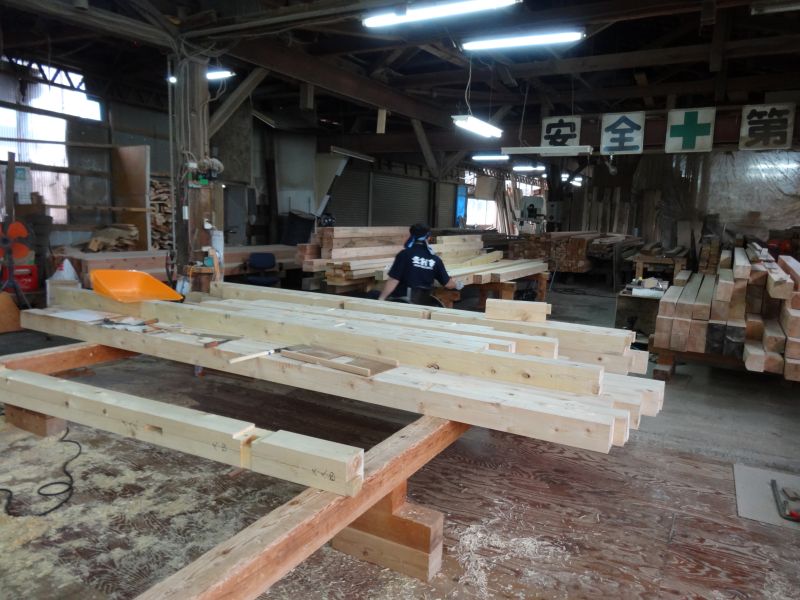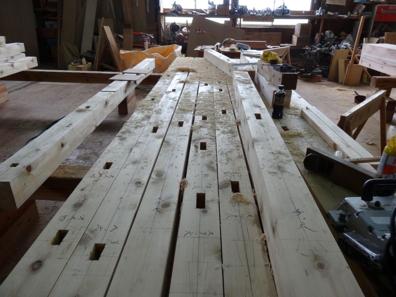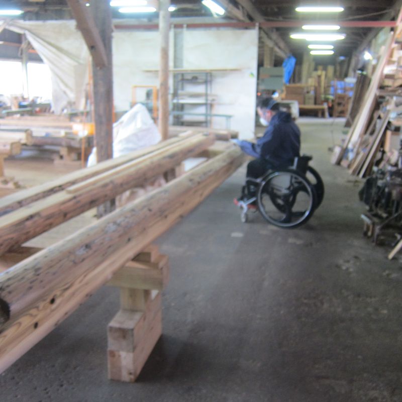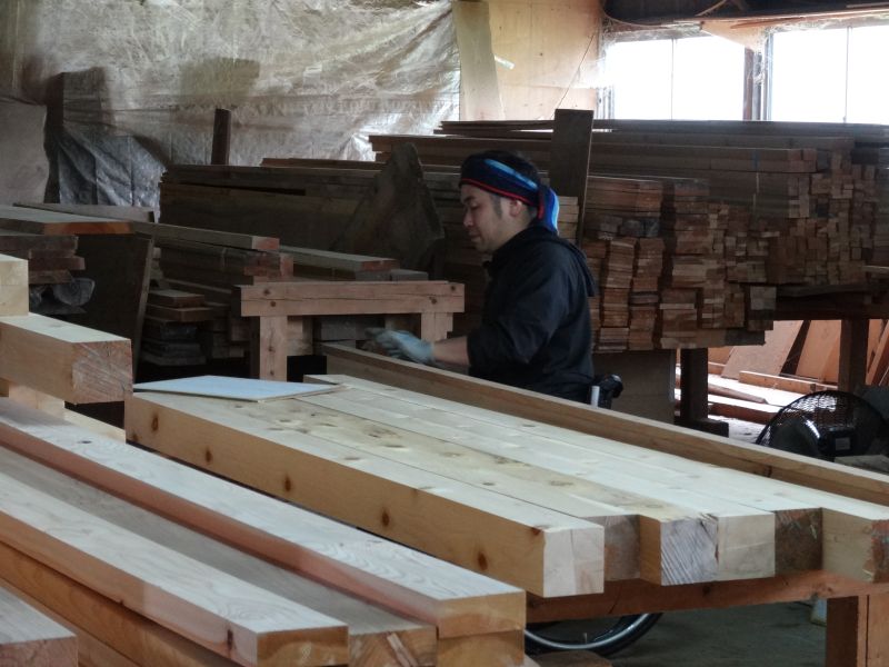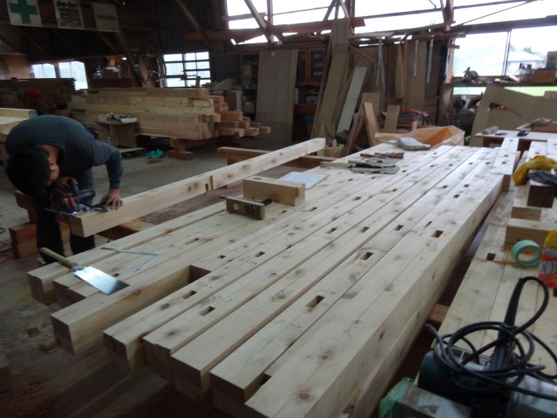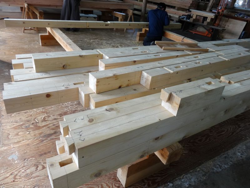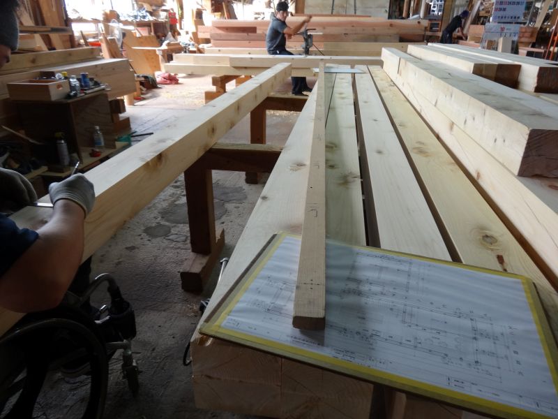 車椅子大工と若手二人による墨付け手刻みは引き続き行われています。最後の写真は、一棟に使われる構造材を写した写真です。この大量の木材が一つの建物に配されます。