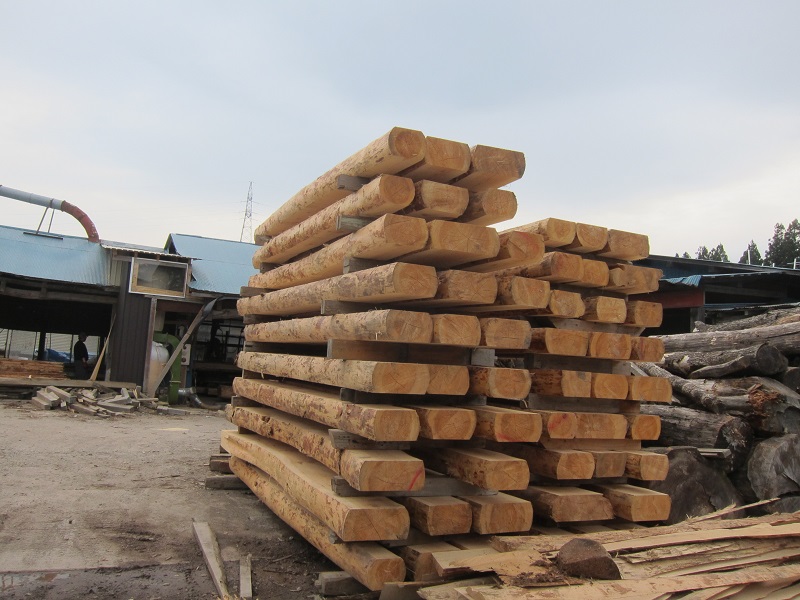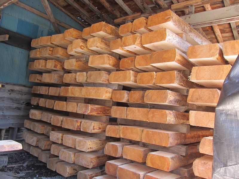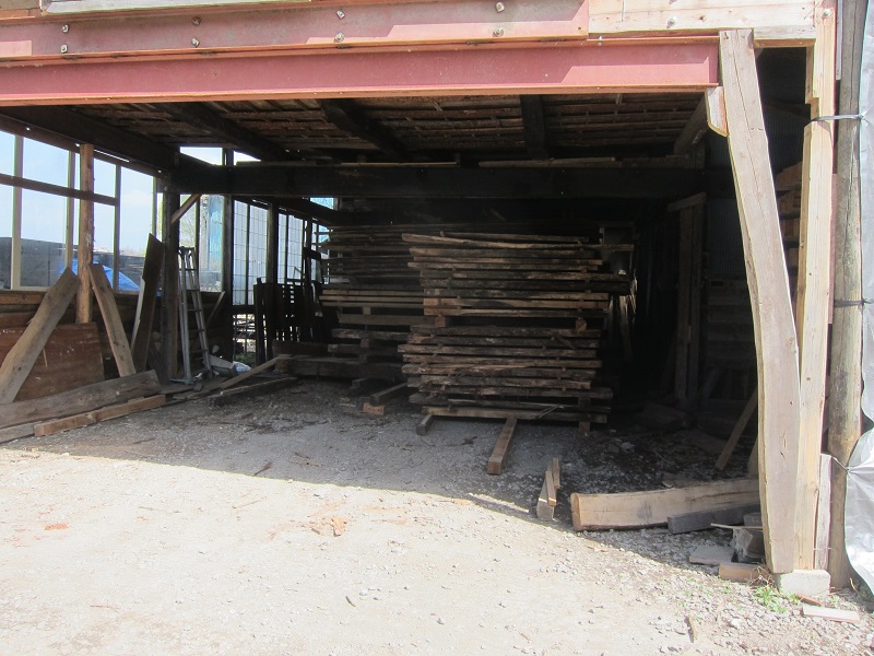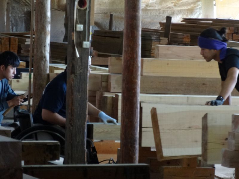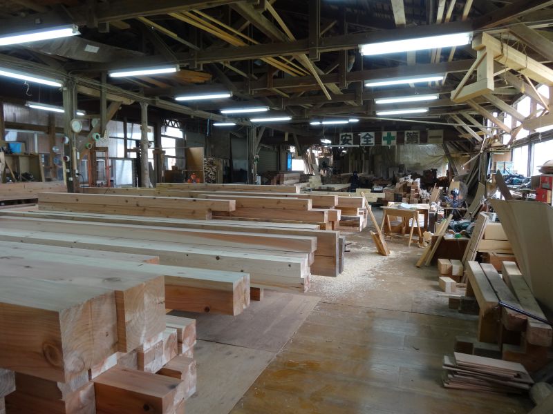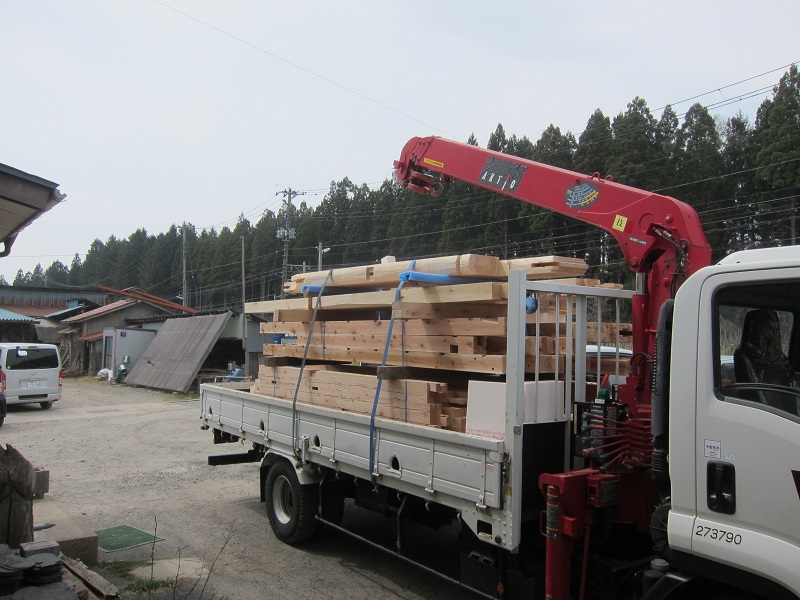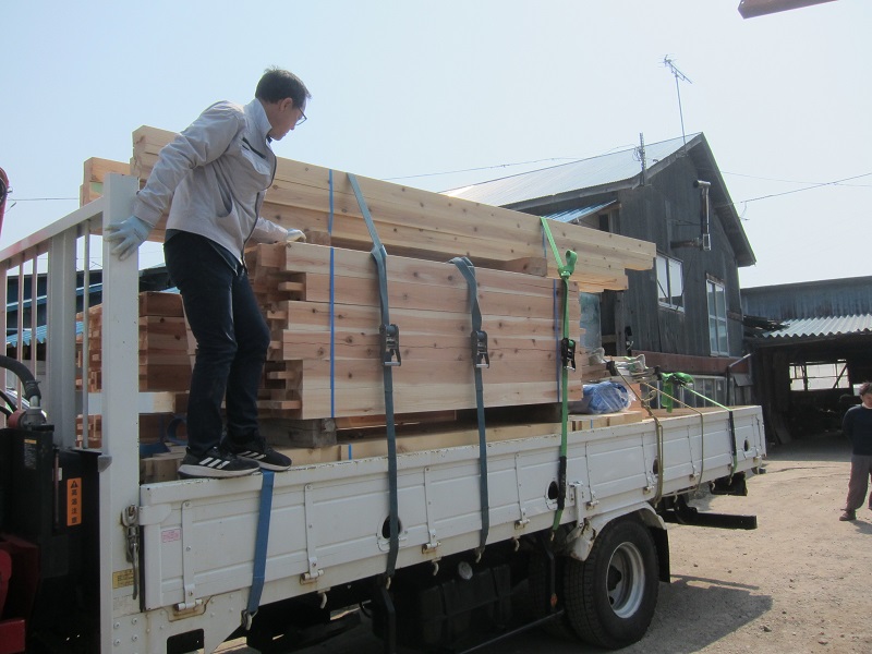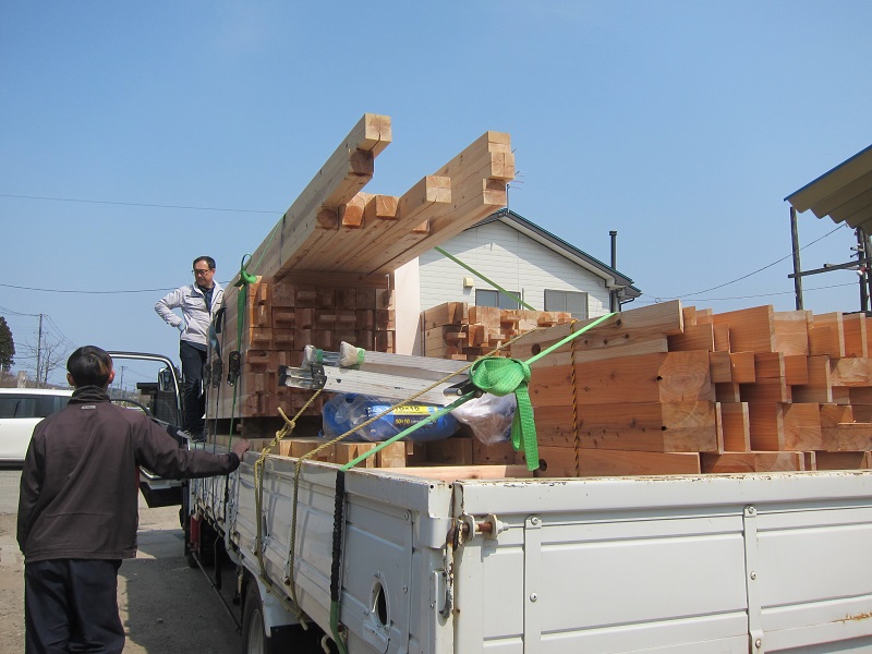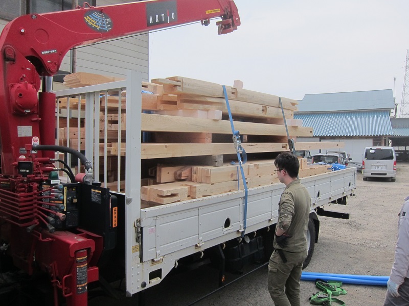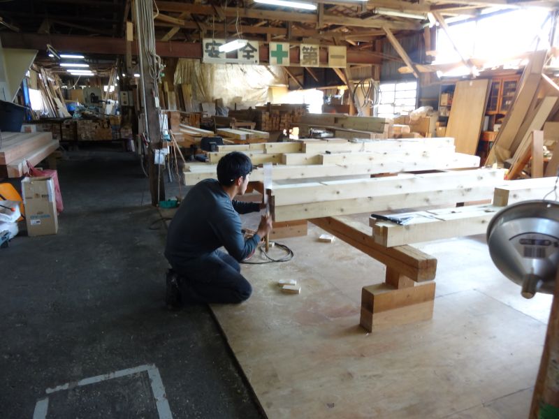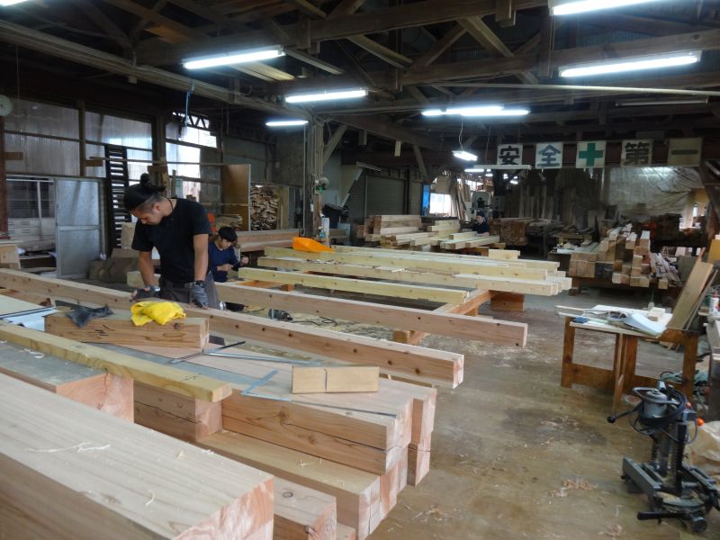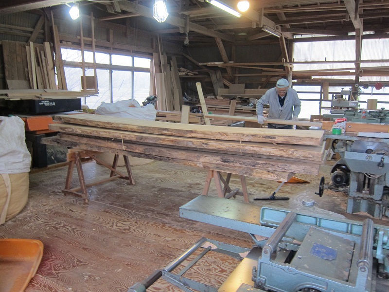 車椅子大工と若手二人による墨付け手刻みは引き続き行われています。最後の写真は、一棟に使われる構造材を写した写真です。この大量の木材が一つの建物に配されます。