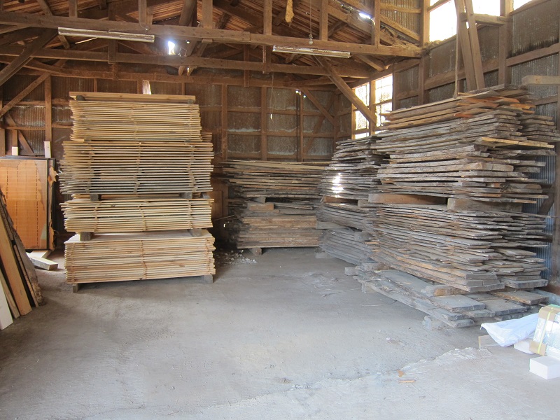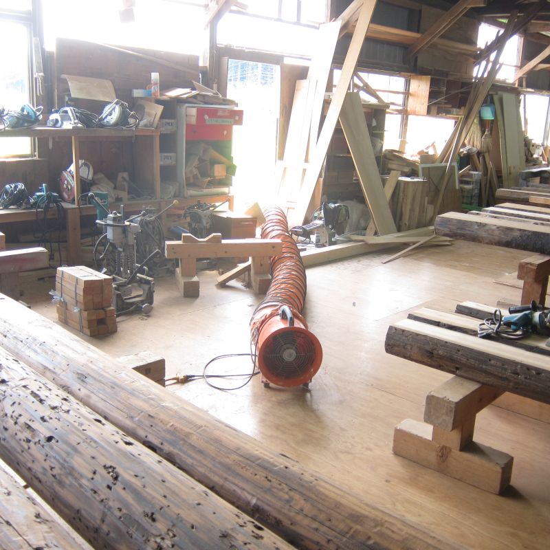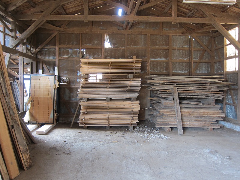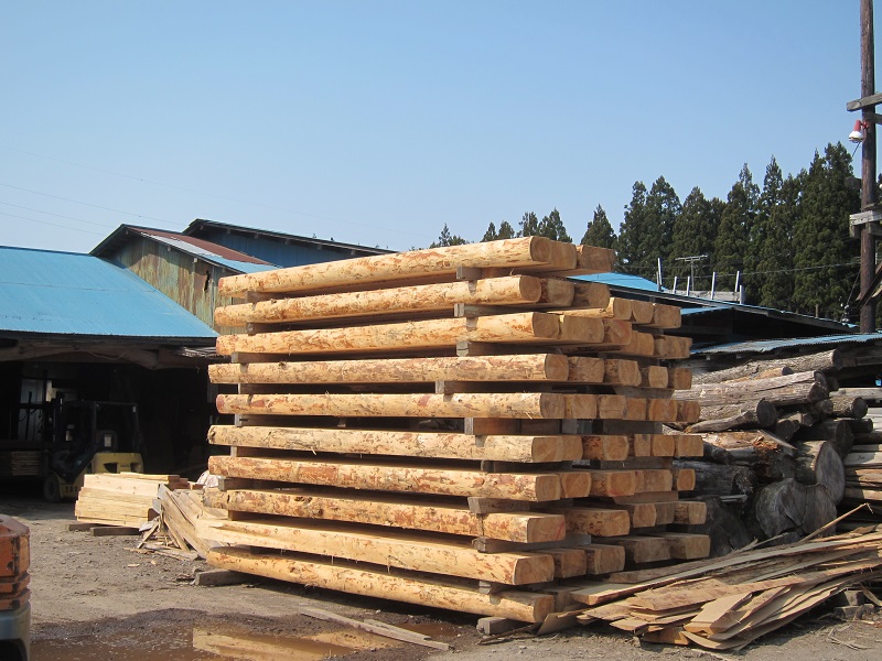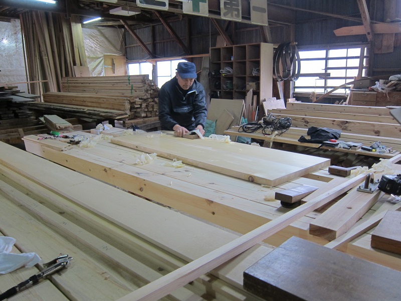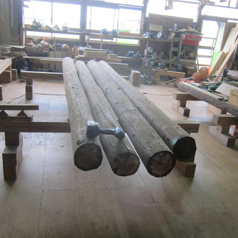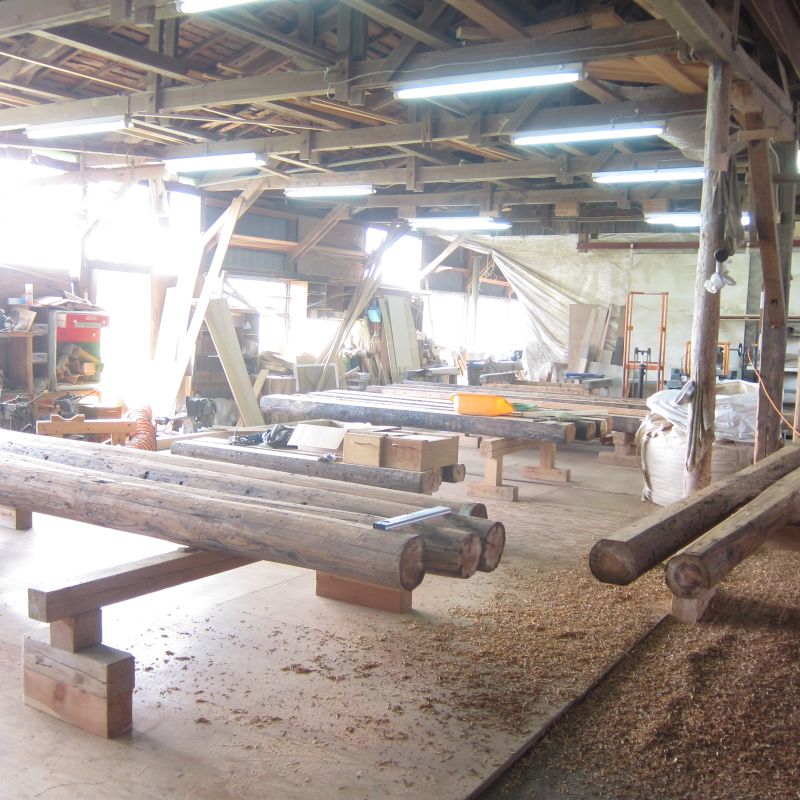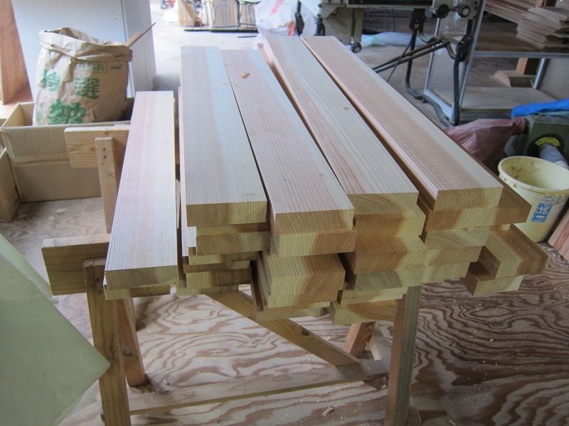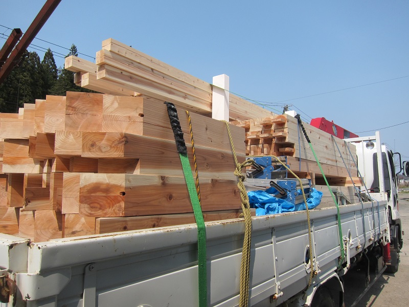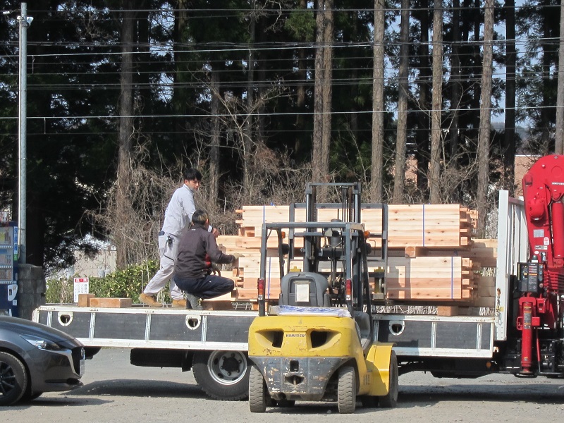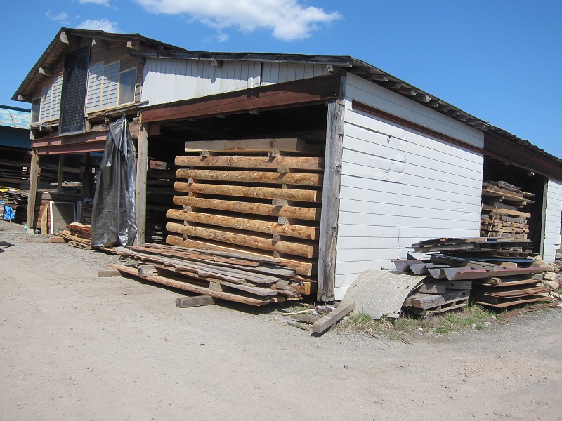 車椅子大工と若手二人による墨付け手刻みは引き続き行われています。最後の写真は、一棟に使われる構造材を写した写真です。この大量の木材が一つの建物に配されます。