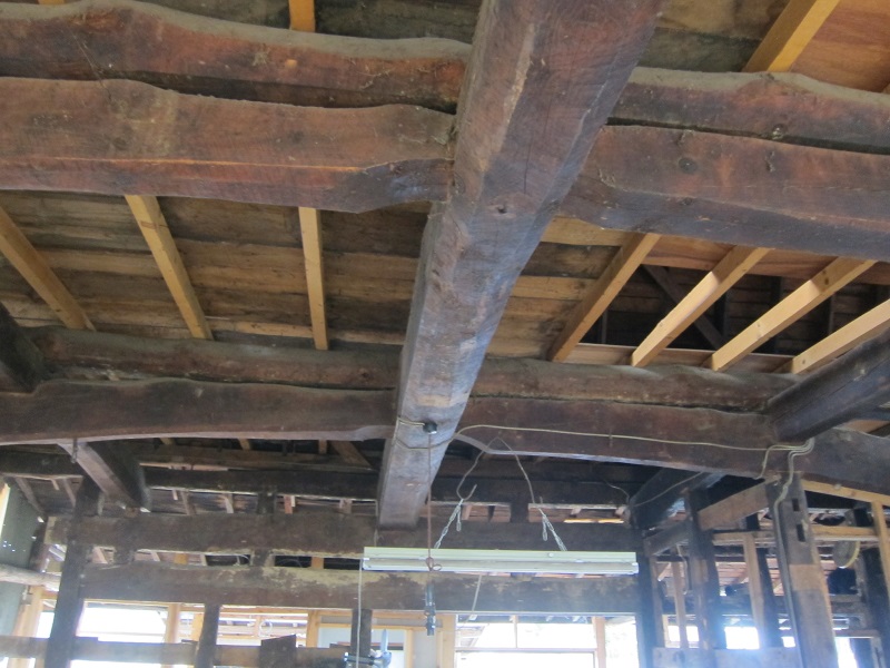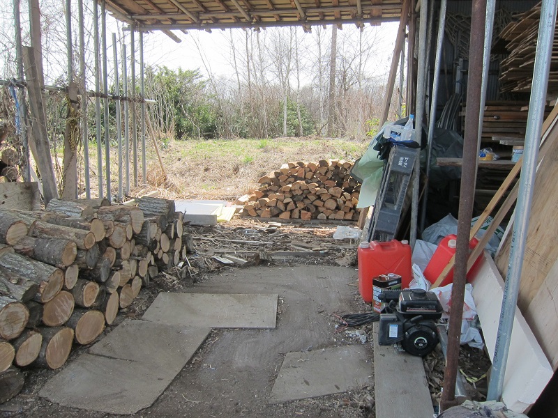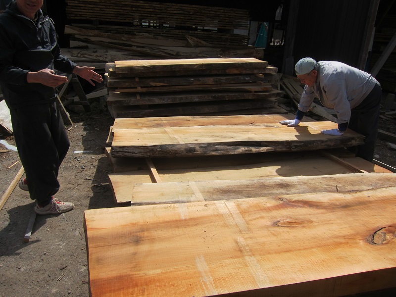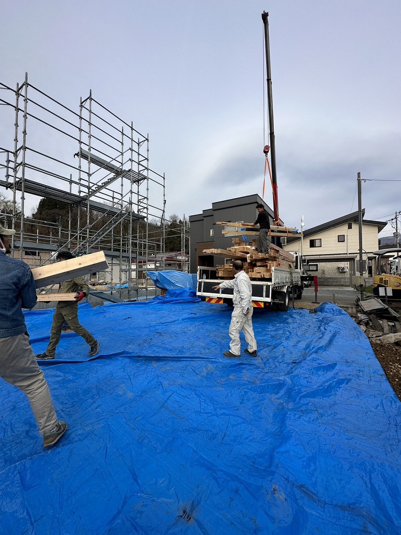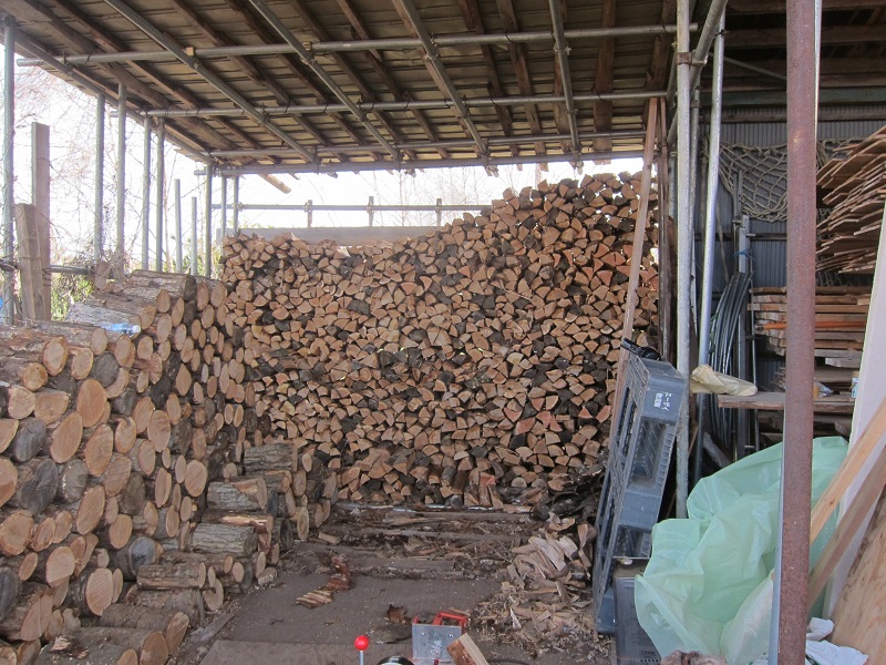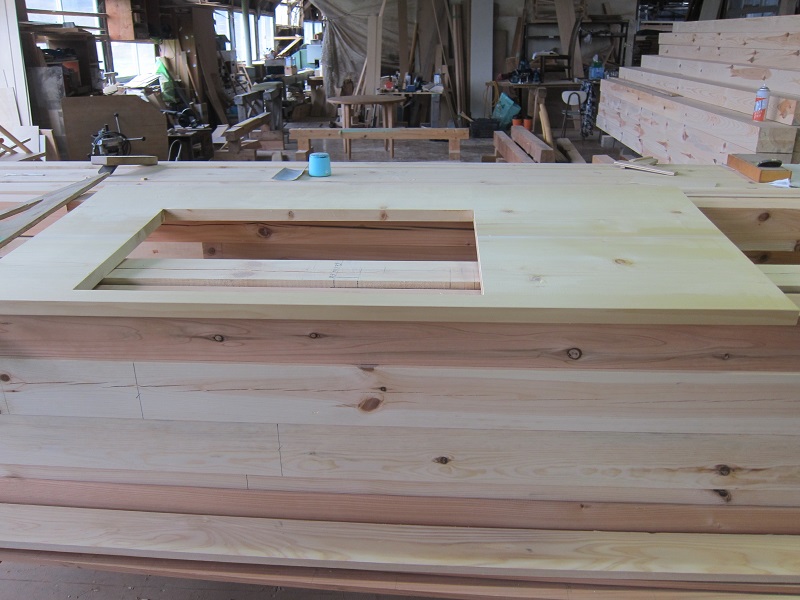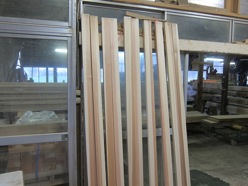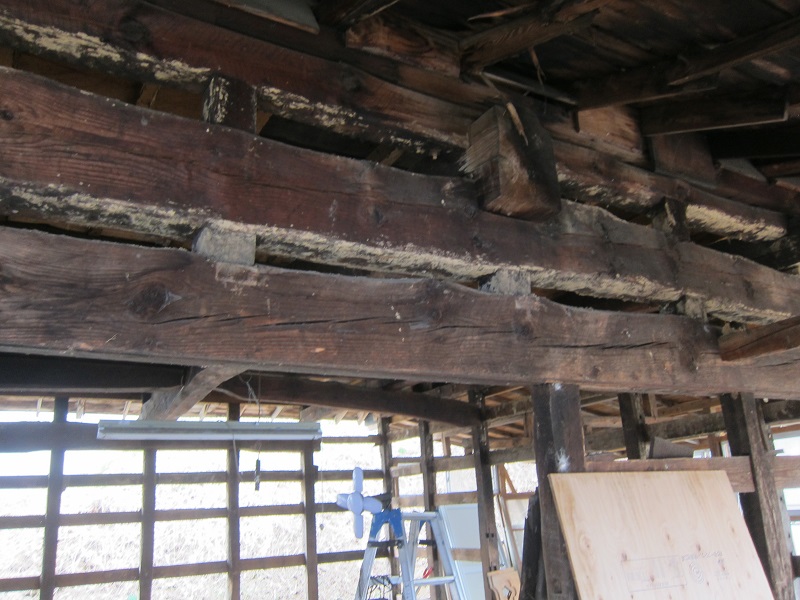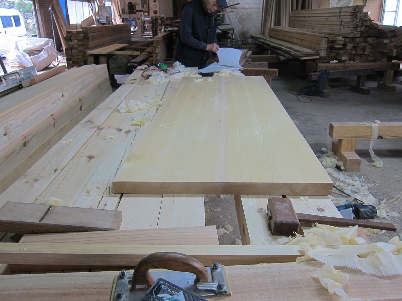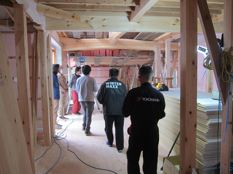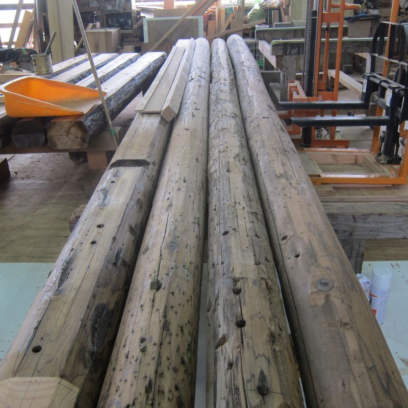 車椅子大工と若手二人による墨付け手刻みは引き続き行われています。最後の写真は、一棟に使われる構造材を写した写真です。この大量の木材が一つの建物に配されます。
