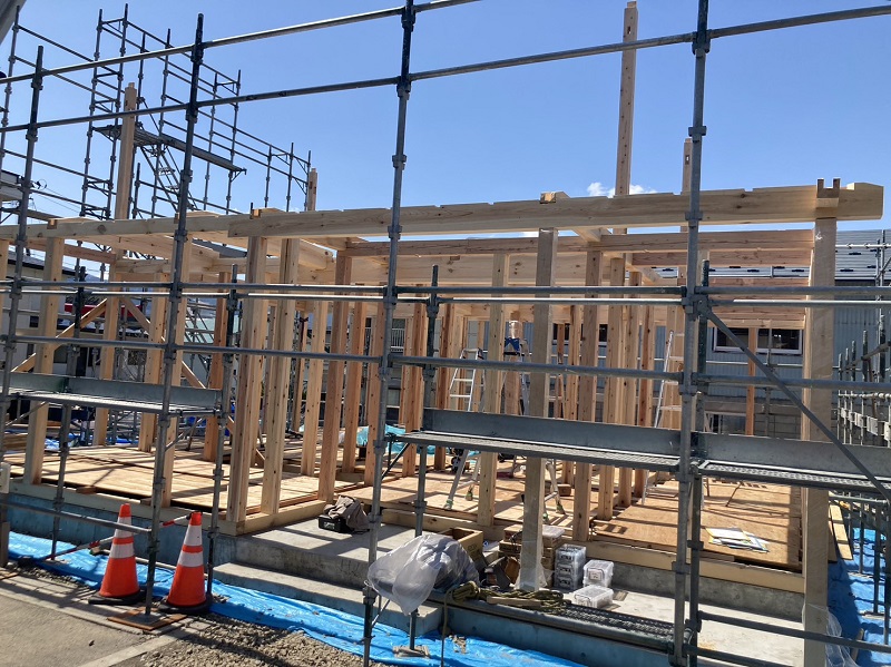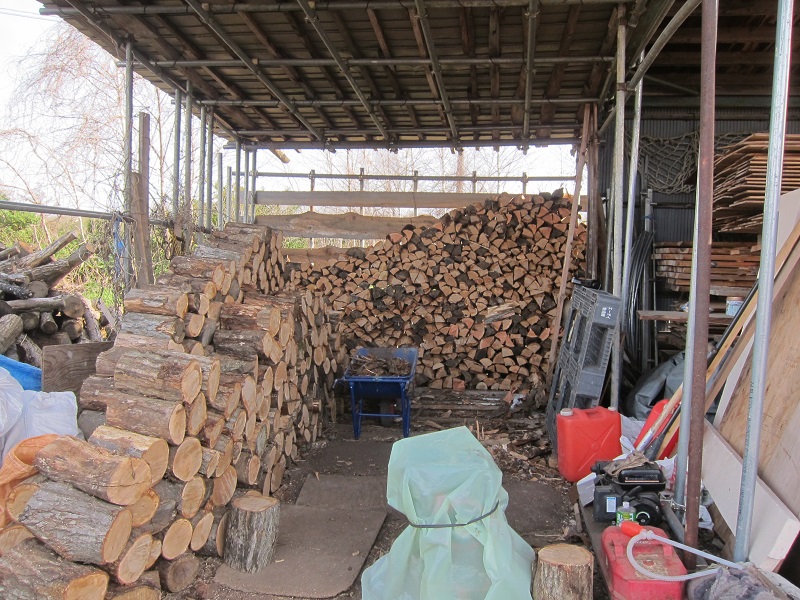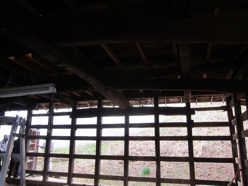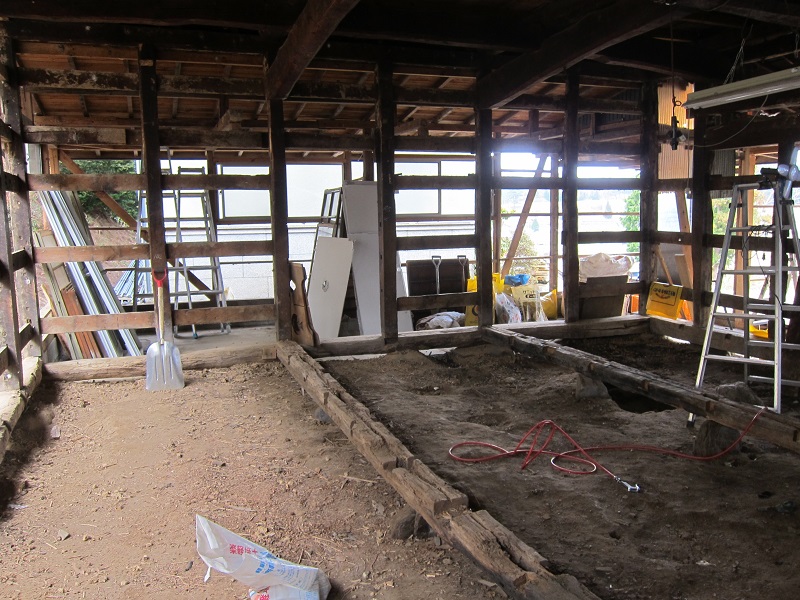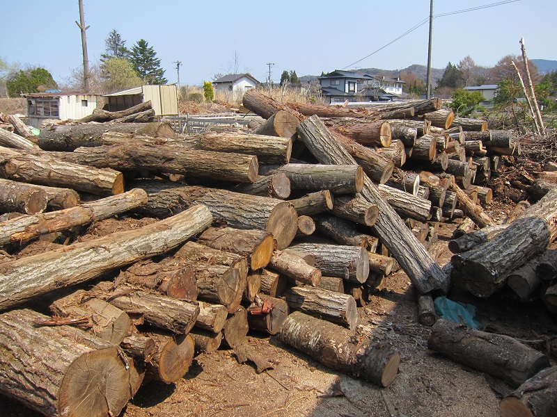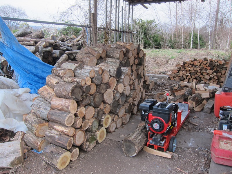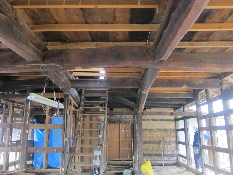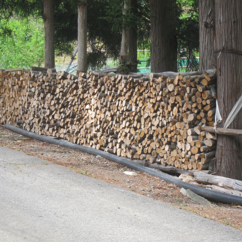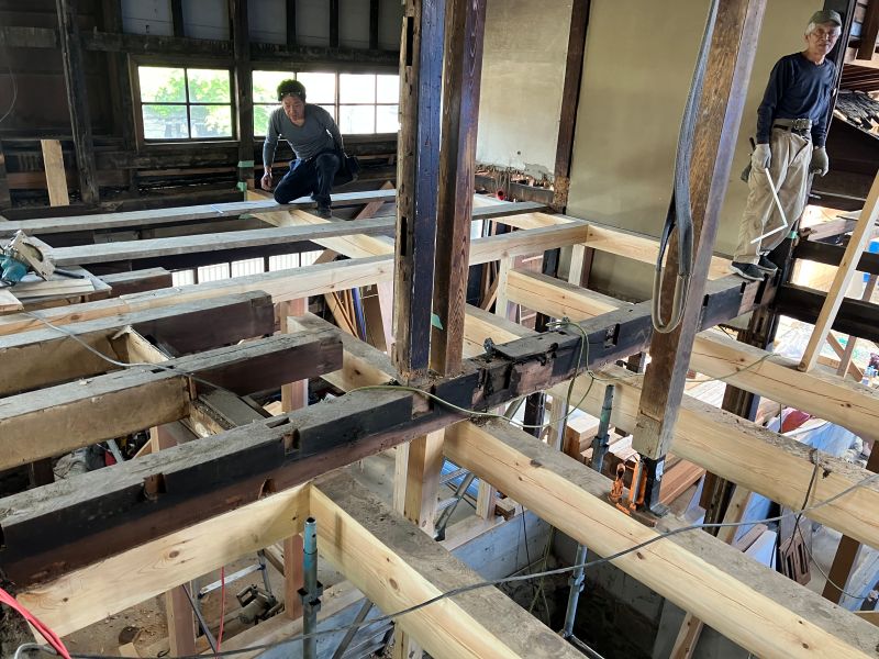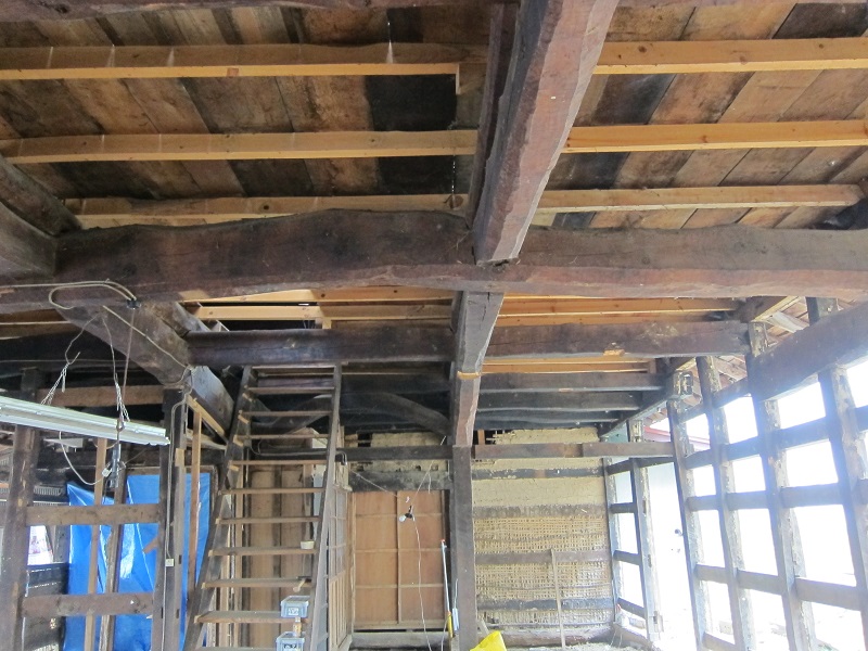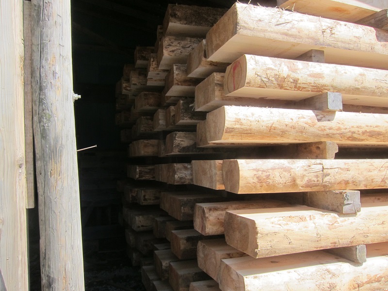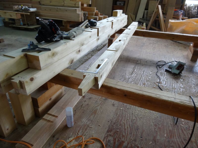 車椅子大工と若手二人による墨付け手刻みは引き続き行われています。最後の写真は、一棟に使われる構造材を写した写真です。この大量の木材が一つの建物に配されます。