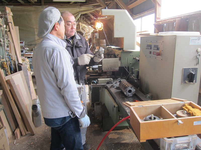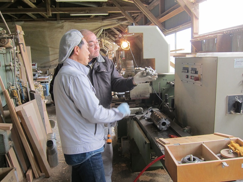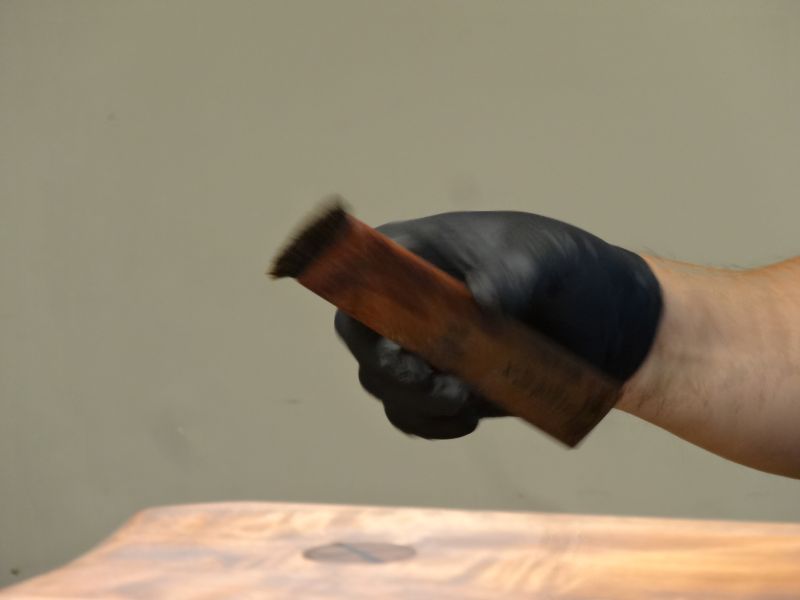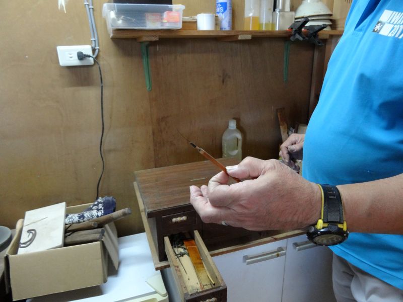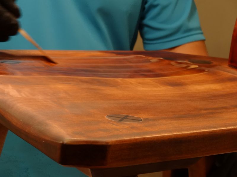木固めが湿度調整が良くて然りと固まり、320番のサンドペーパーで磨き落とし、固く絞った布で拭き取ってから乾かして、吹き塗塗りの工程が進みました。写真内に見える漆刷毛は家具職人のお父さんが盛岡竿を創る職人だったので、今でもこうして使えるとてみ貴重な道具らしいです。調べてみるとやはり漆刷毛を創れる職人が少ないらしく人毛を檜の板で挟んで作るらしいです。この時家具職人は海女さんの髪の毛が良いらしいと説明しながら塗布していました。そして、直ぐに拭き取るのです。なので、これを葺き漆仕上げと言います。