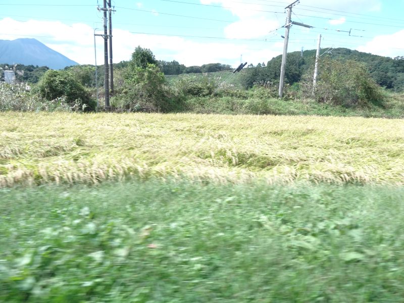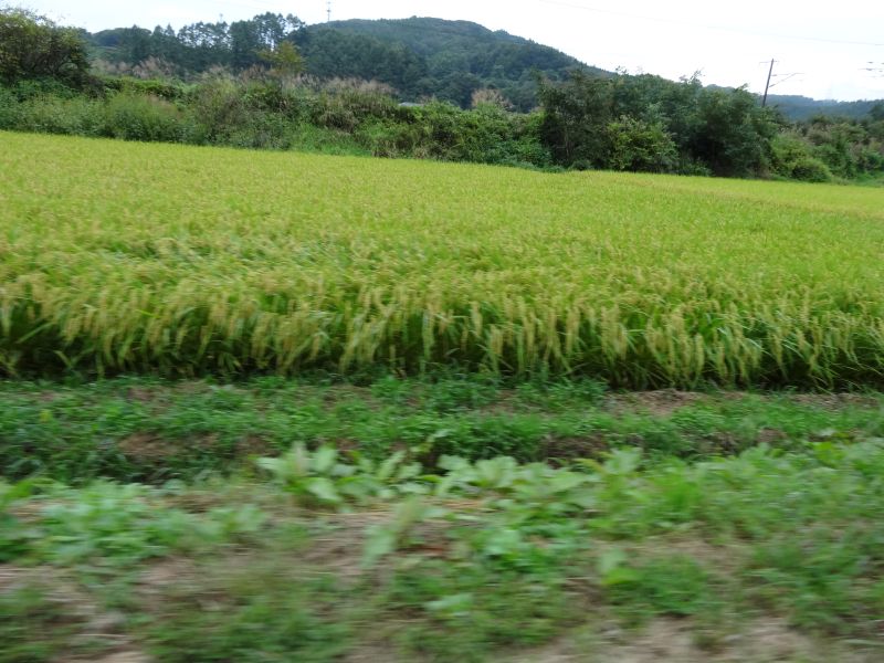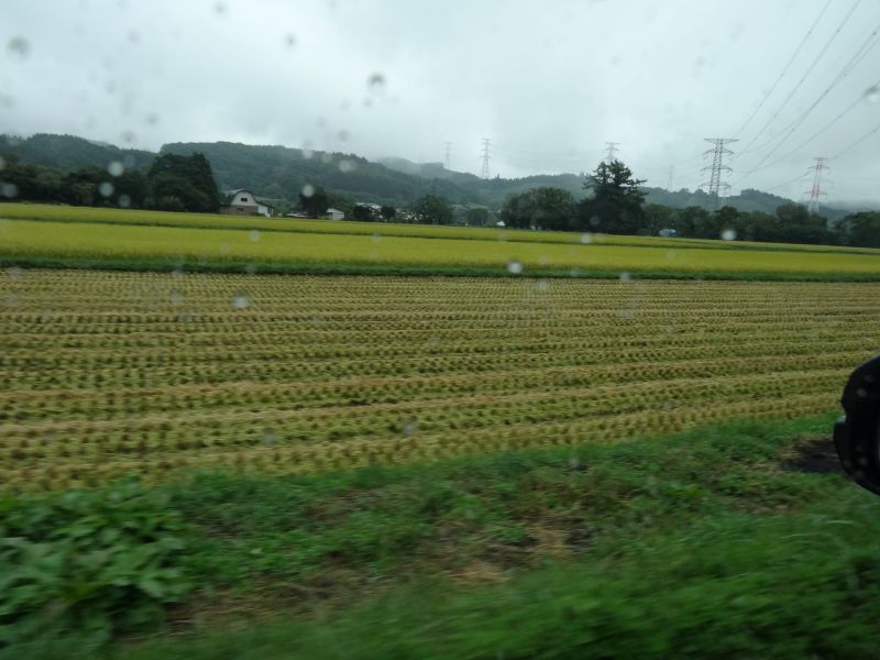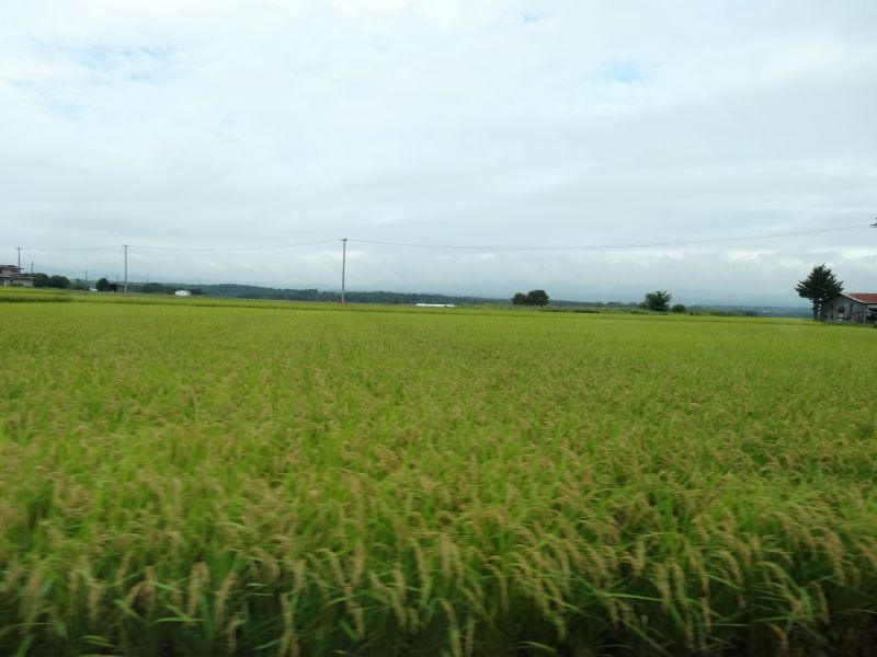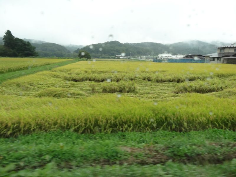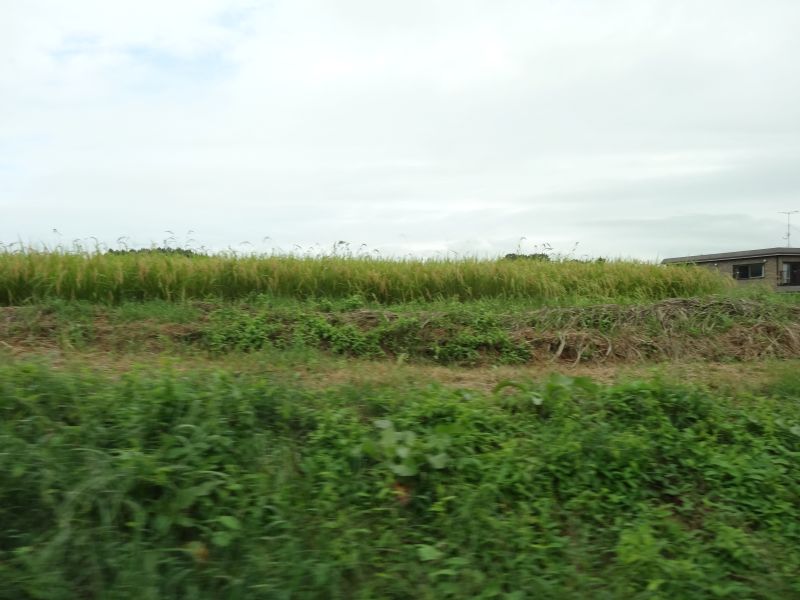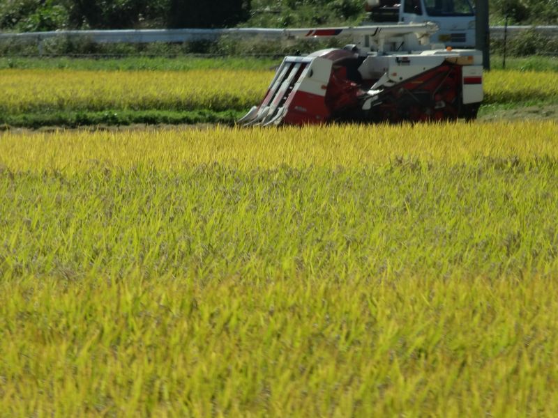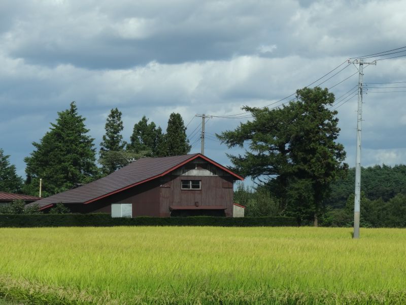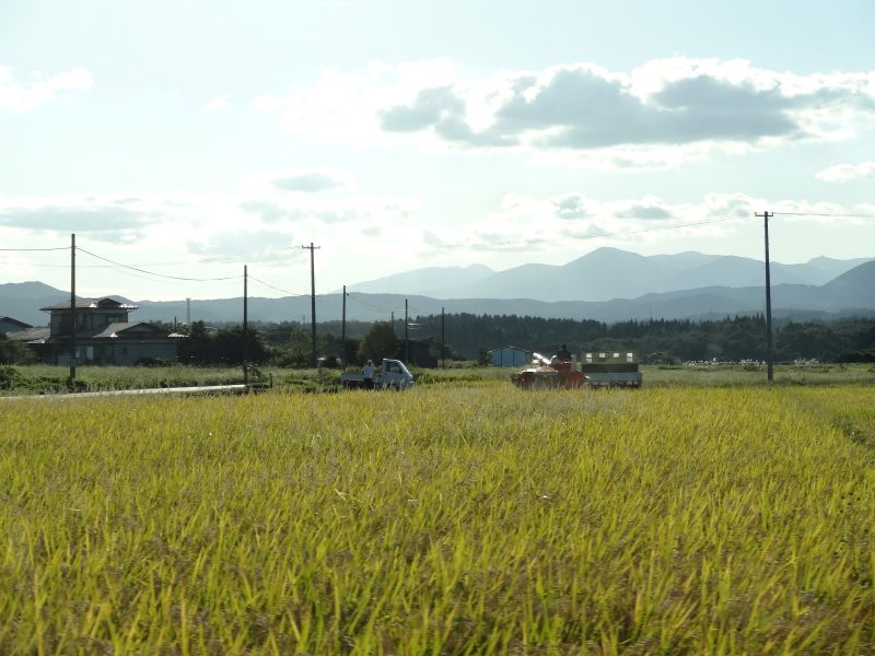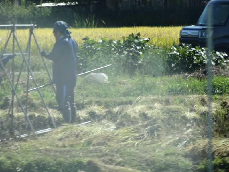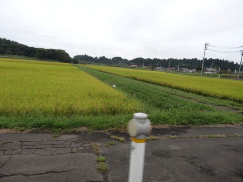 前日の大雨で倒伏が出てきて心配していたのですが、一部稲刈りが進み始めましたね。稲光る光景と、稲の中に浮かぶように見える山や家がこの地域の村の姿であるかのように美しく見えます。稲の海を漕ぐかのような風景が広がる村の景色です。