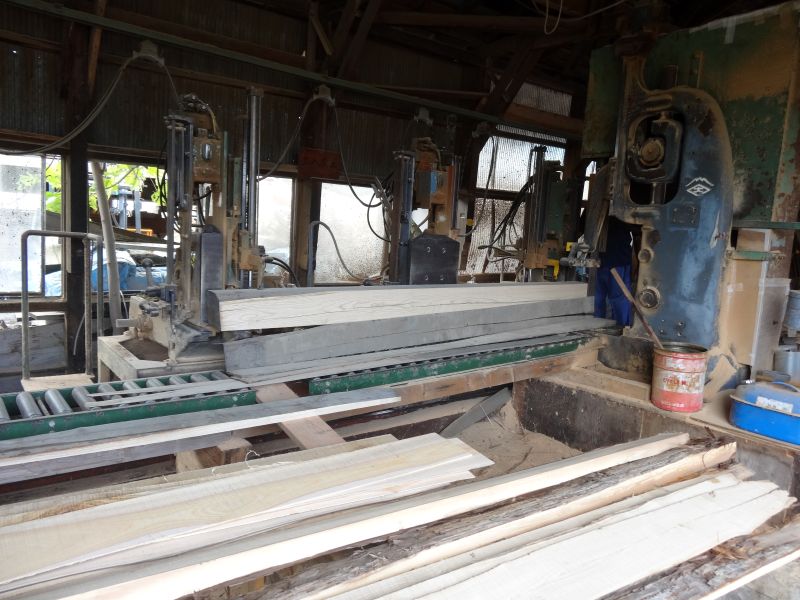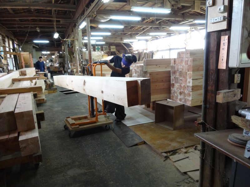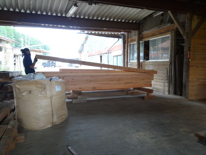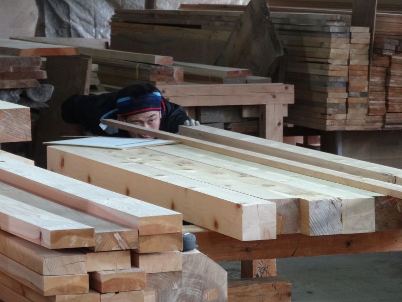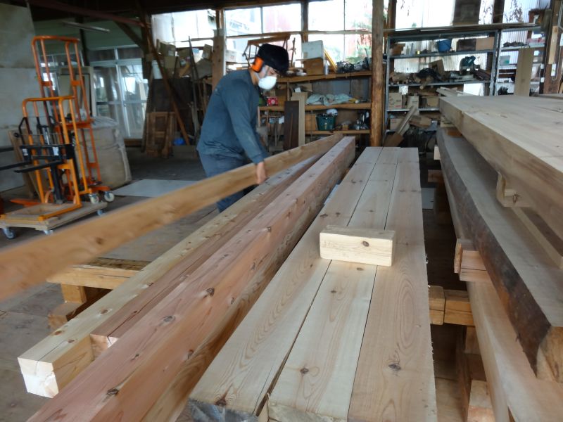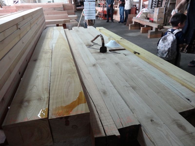毎日修正挽を続けています。写真は修正挽前は古びた感じになっていたのに鋸を通すと綺麗な元木の木肌が見えてきたところです。残屑を吹き払いながらの作業が続いています。