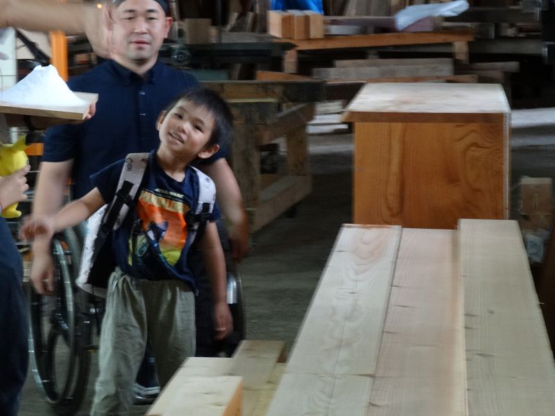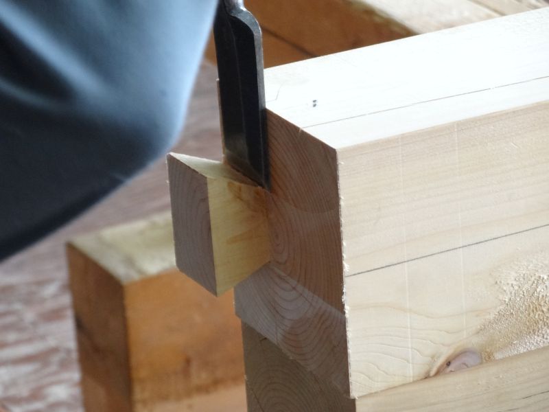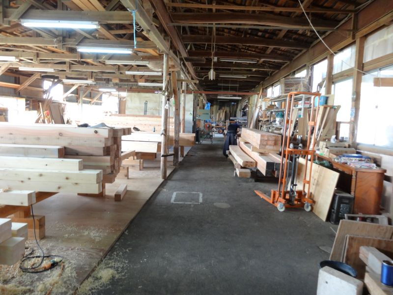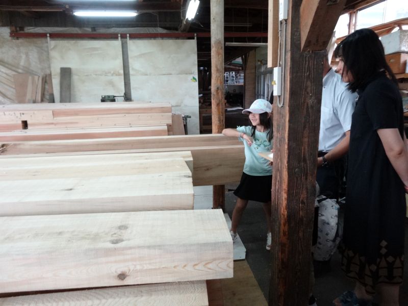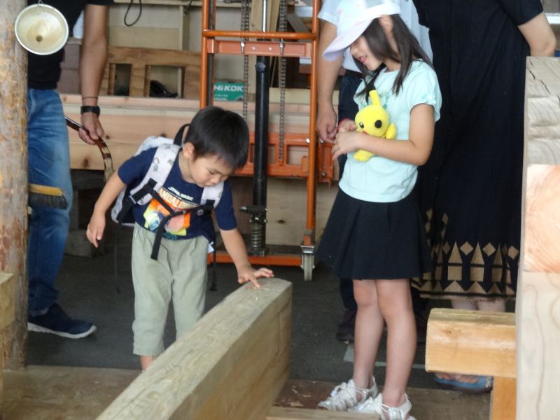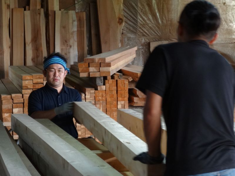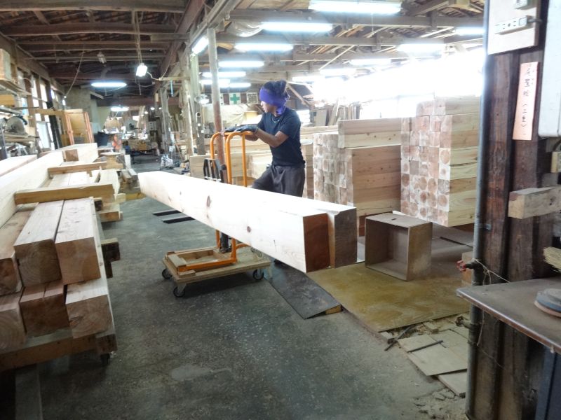 毎日修正挽を続けています。写真は修正挽前は古びた感じになっていたのに鋸を通すと綺麗な元木の木肌が見えてきたところです。残屑を吹き払いながらの作業が続いています。