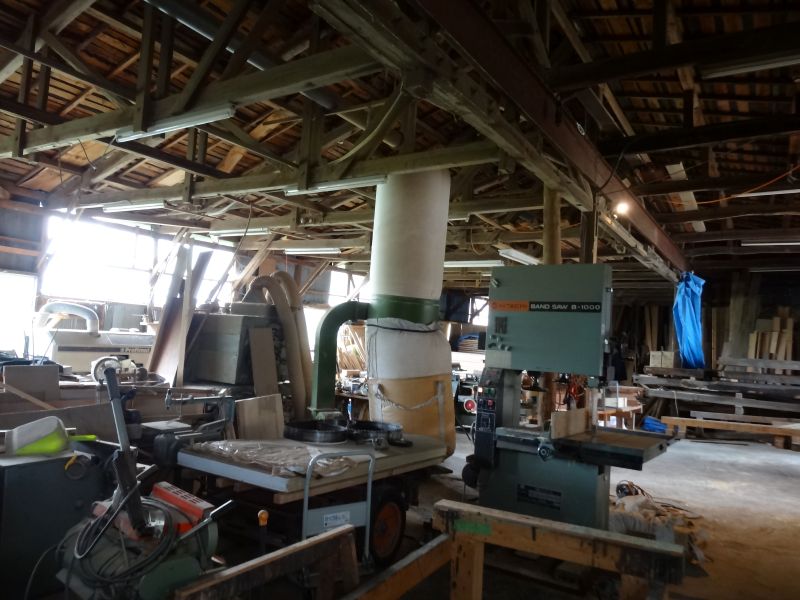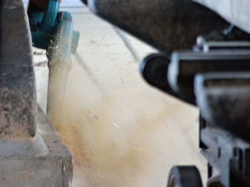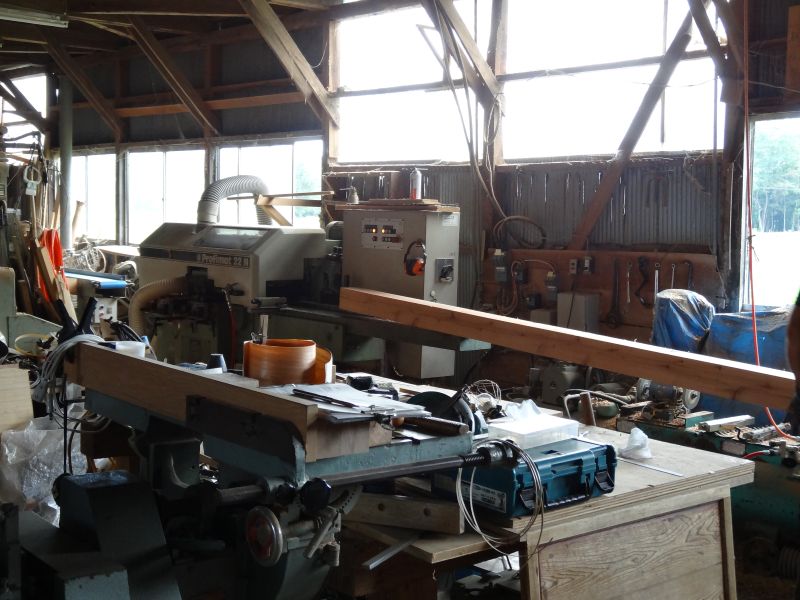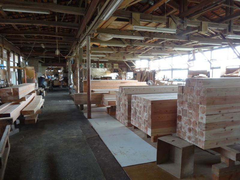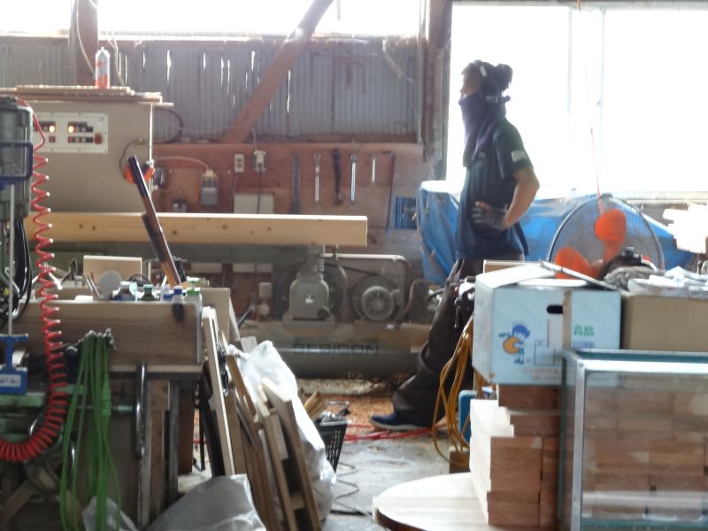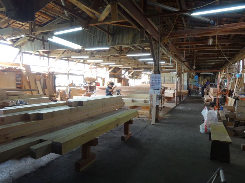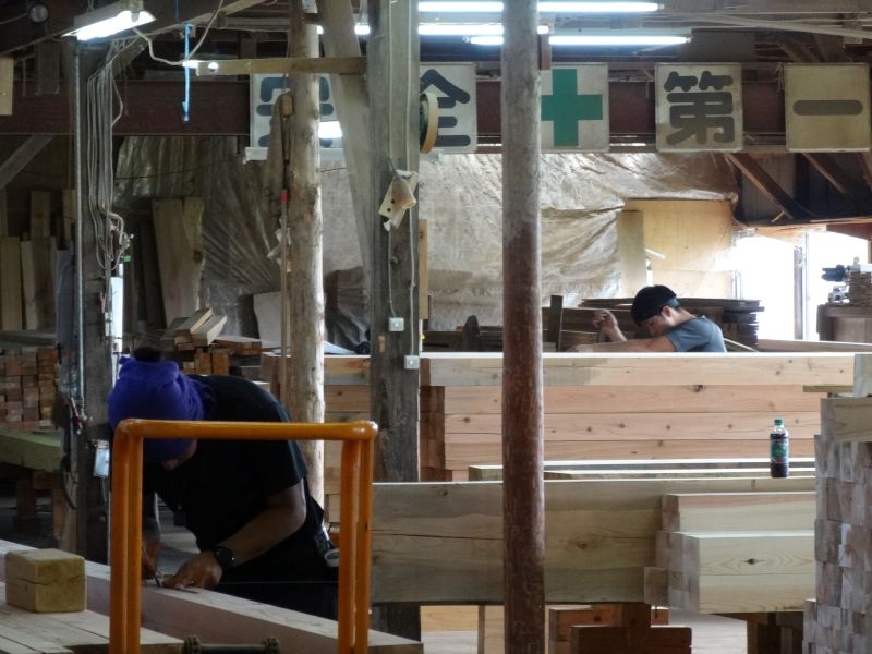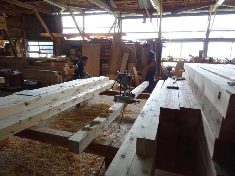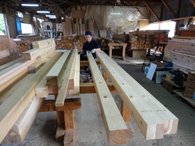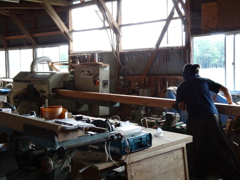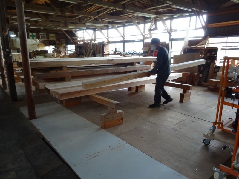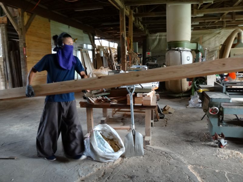 修正挽が終わると、今度は、構造材の断面を一律に揃えて、墨付けをし易くするために、四面自動鉋機のモルダーに材料を通して鉋を掛ける作業に入ります。ここでも、機械に角材を入れる担当一人出てくる材を受け取り並べる担当一人の二人一組でのでの連携があります。そのほかに、機械の調整や、集塵機のセッティングなど重要な部分を家具職人が行って若手に教えて指導しています。