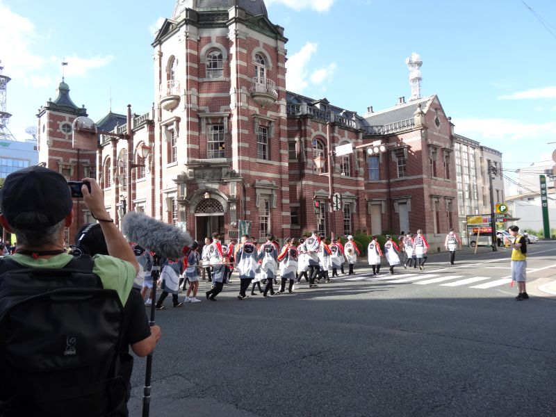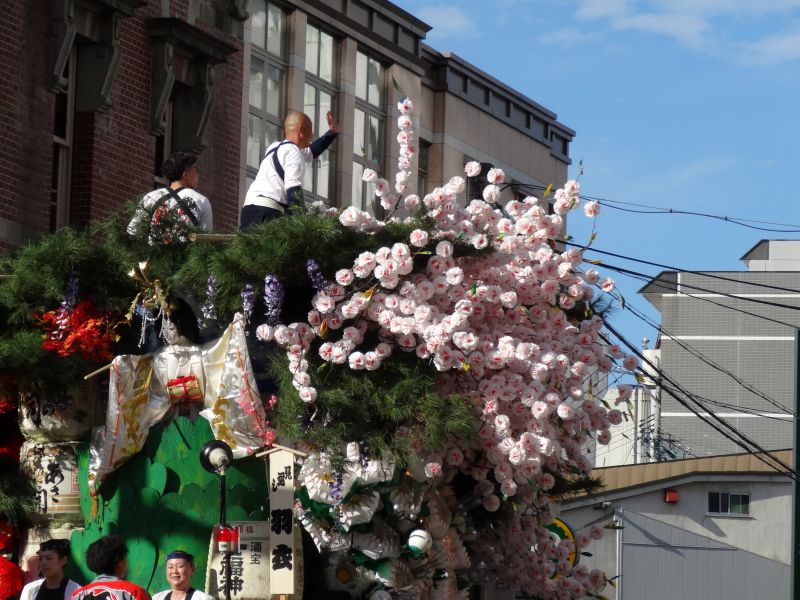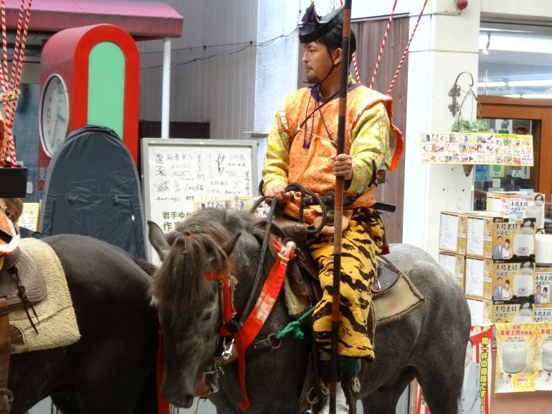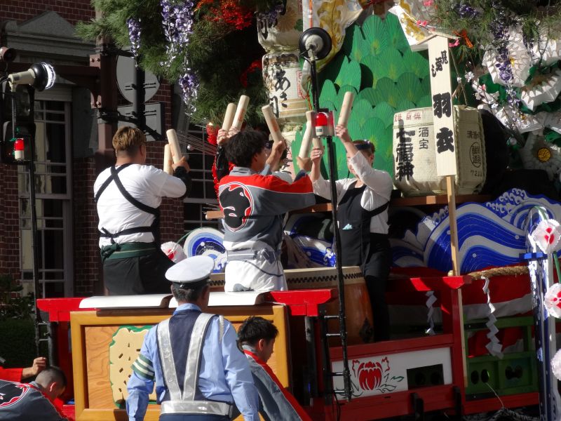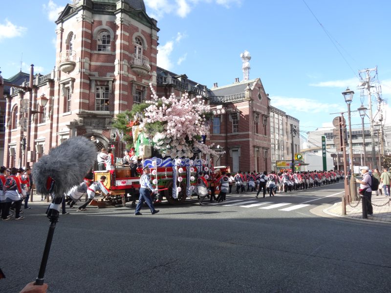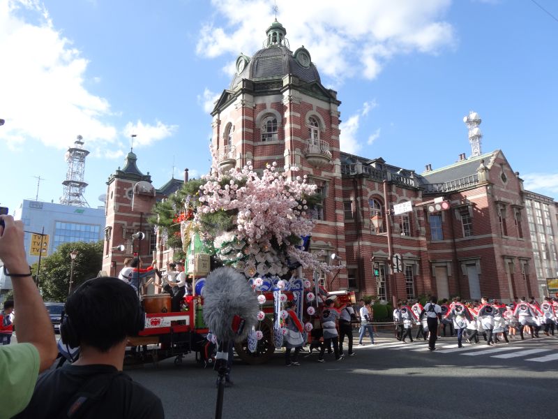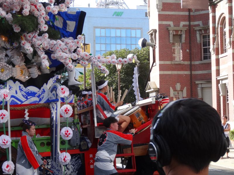 遠くから聞こえる「ヤーレヤーレ」と太鼓の音に山車だと気が付いて、杖を突きながら肴町商店街アーケードを急ぎ足で、旧岩手銀行レンガ館方向に向かうと、盛岡秋祭りの山車が、丁度その前を渡る瞬間に遭遇していい写真が写せました。