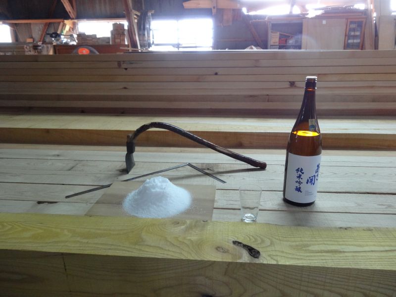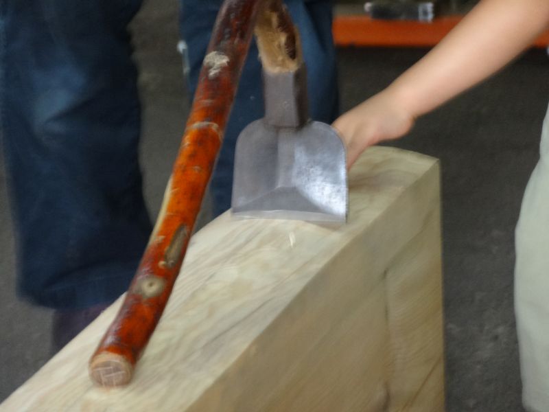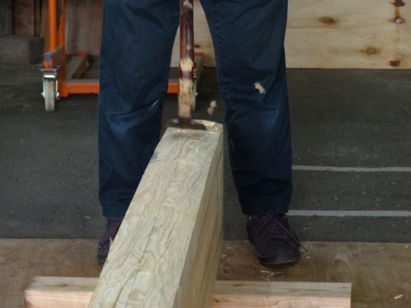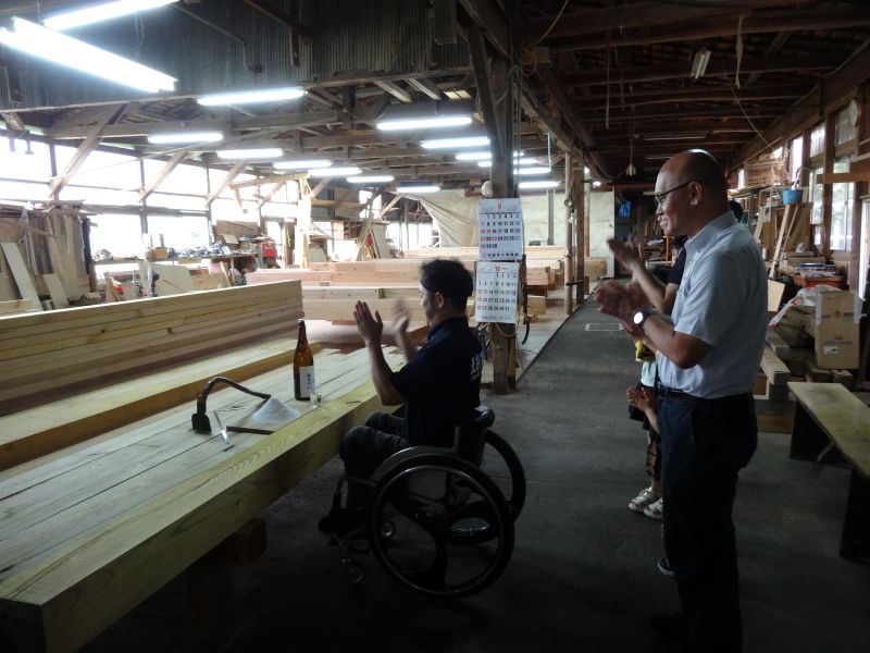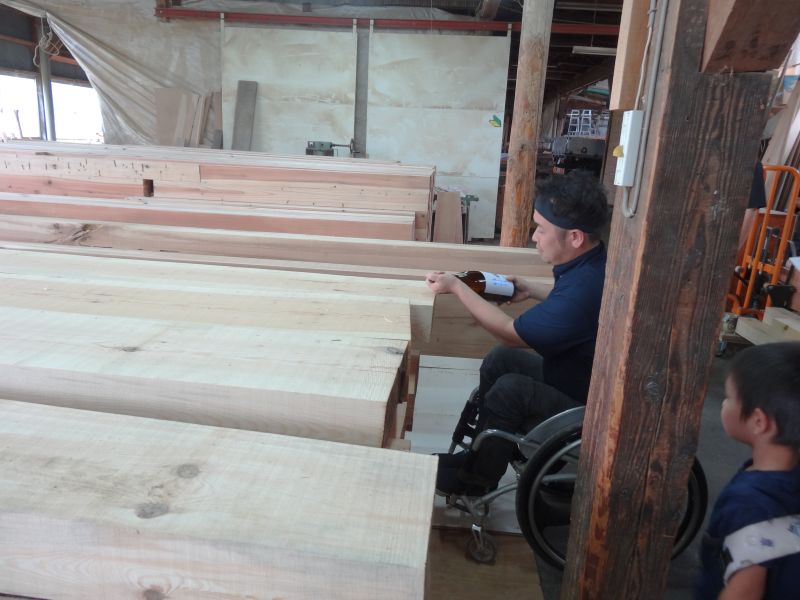 先日、次回鉈屋町での新築現場の構造材の木材の清め式が執り行われました。前日その準備に取り組む車椅子大工は、既に墨付けに取り組んでいて、四面自動鉋を掛けた土台の積み直しを車椅子に乗りながらこなしています。木材の清めとは、建て主様と墨付け手刻みを行う大工が共に、塩とお神酒で住まいに使用する構造木材の清めを行う儀式です。この時に、柱は雫石の杉で梁は米内川の上流で盛岡の街を水害から守ってくれた赤松で通し柱は岩泉町、他重茂半島の杉材などと木がどこから来て建物のどこにどの様に使われるかを説明させていただきます。特に桂の梁や、欅に漆、そして栗に桜など雑木も特に見える場所に配されるので、念入りにご説明させていただきます。そして、清めが終わり気持ち的に綺麗に白紙化したところで、初の刃物を入れるのをお施主様にチョウナで実際に殴り込みハツリを行っていただきます。