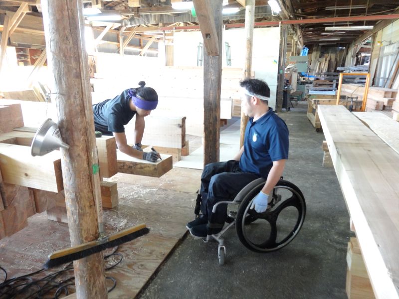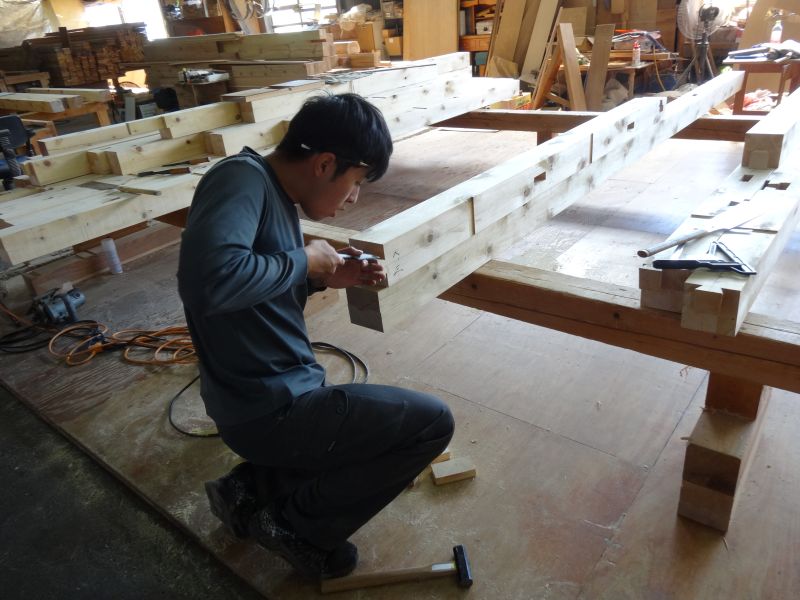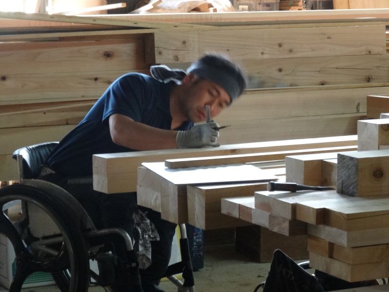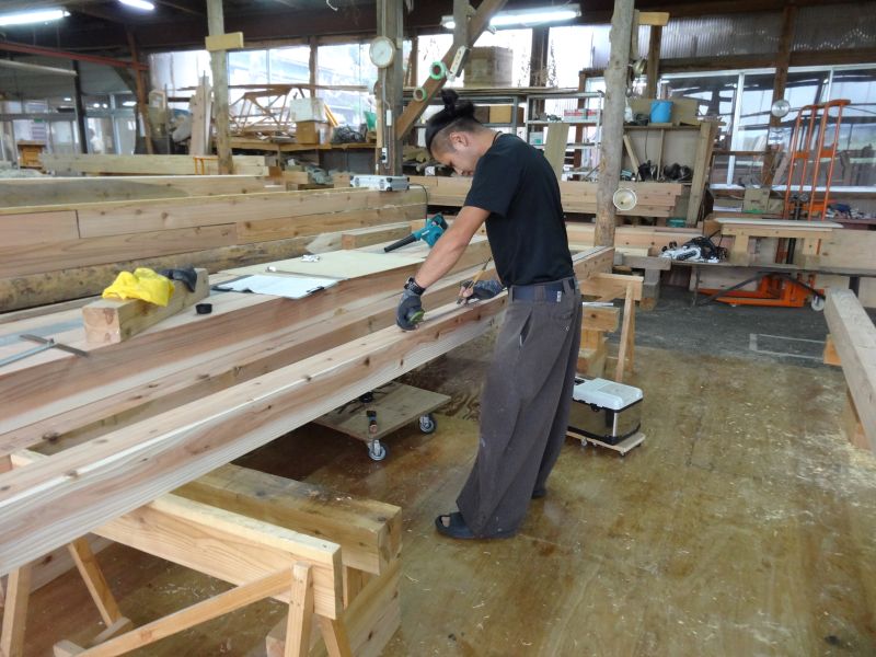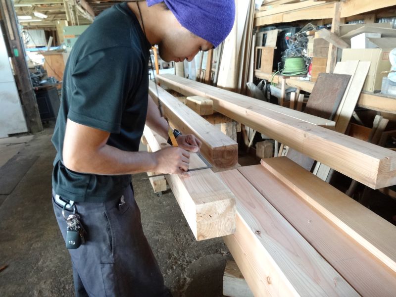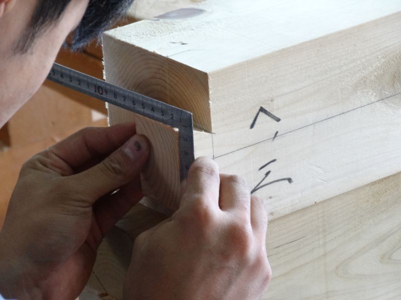 先日の木材の清め式が行われた鉈屋町での新築工事の構造材に墨付けが始まりました。そして、そのまま刻みも進めています。これは、若手大工が墨付けを行う車椅子大工のサポートを行いながら、出来る部分の手刻みも行う作業工程です。また、若手大工も手分けして墨付けを行います。車椅子大工のサポートのみならず、若手大工も経験を積める良き取り組みと捉えています。