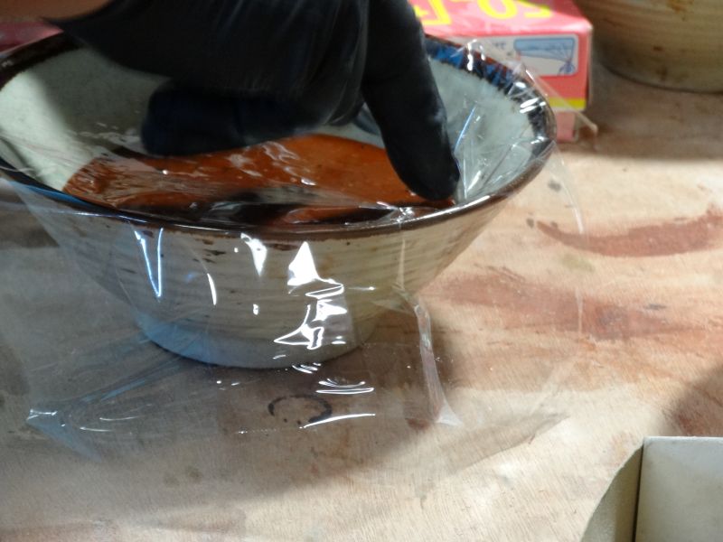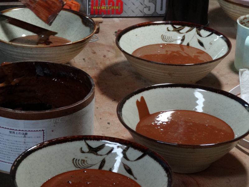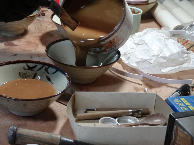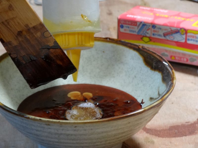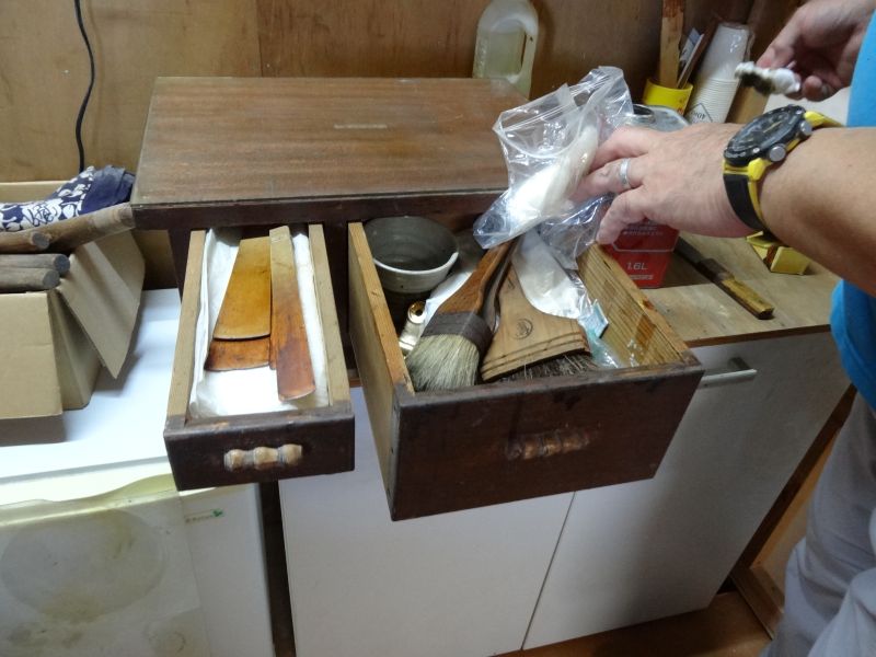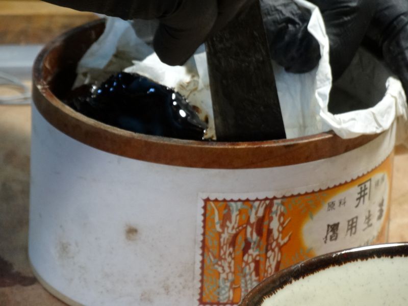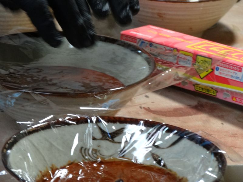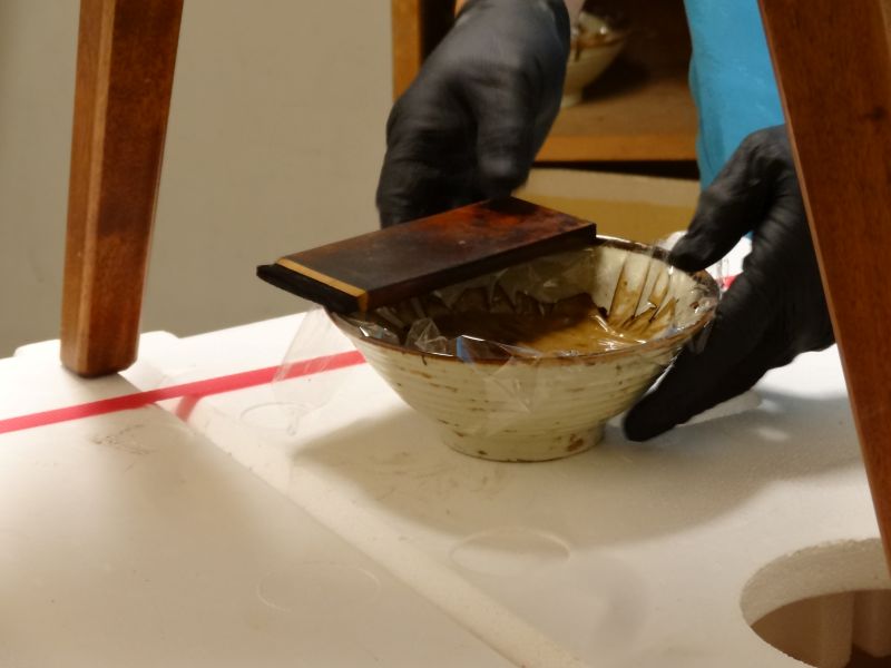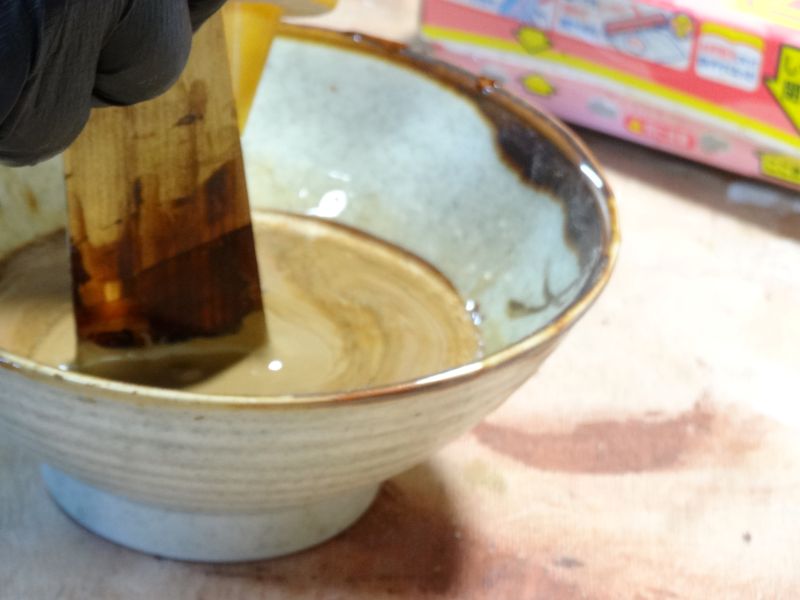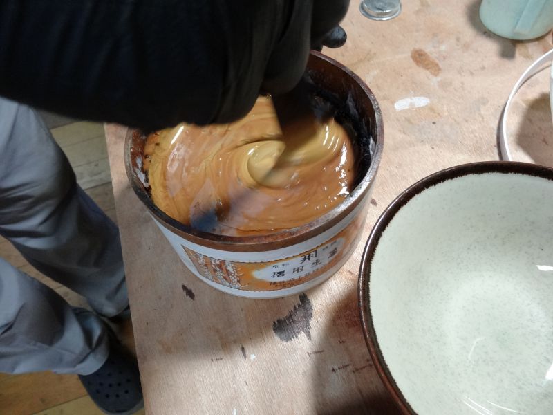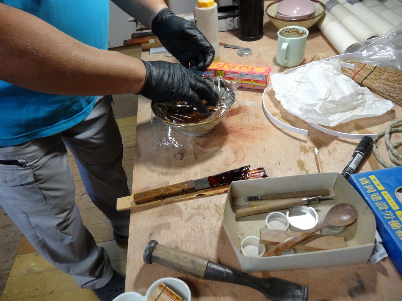 漆塗りの準備をしています。年季が入った道具箱を手に木固めようの漆を混ぜ混ぜしてから、サランラップですぐさま酸素に触れないように蓋をしていました。このサランラップでないと駄目なんだそうですよ。