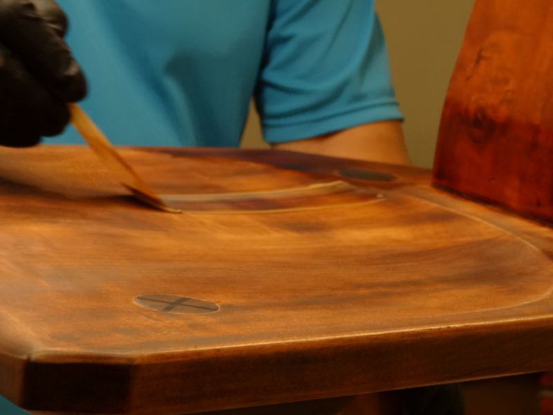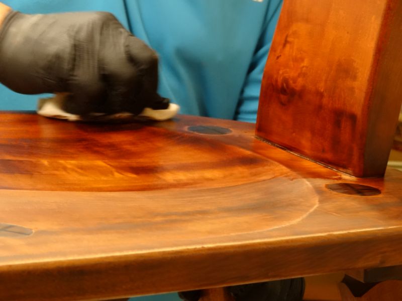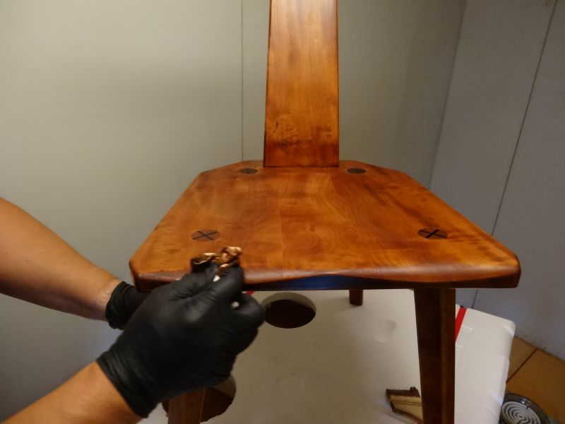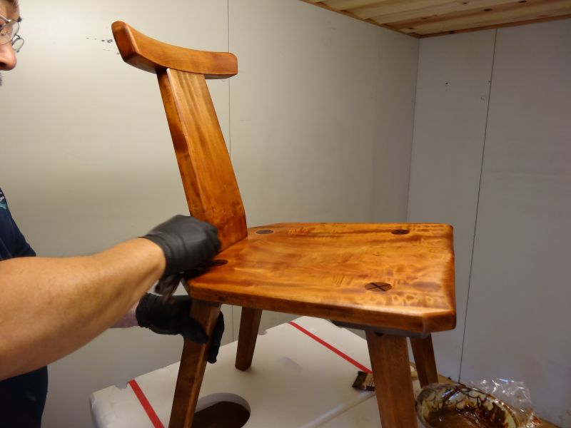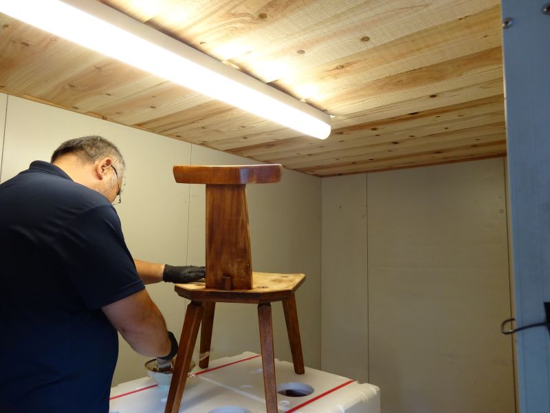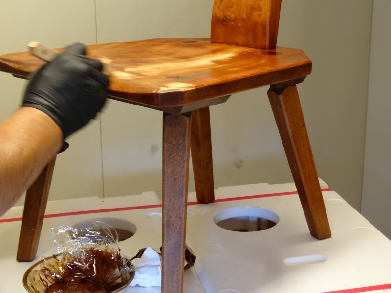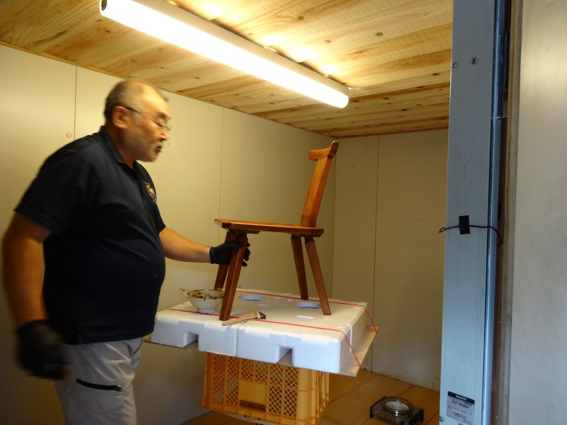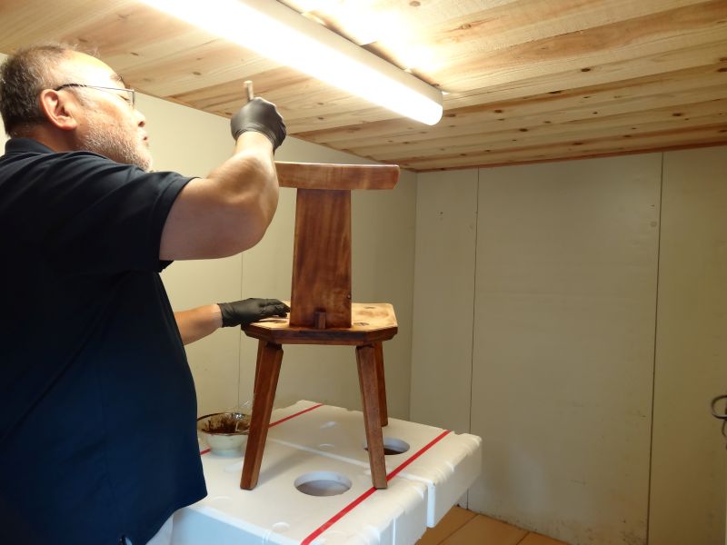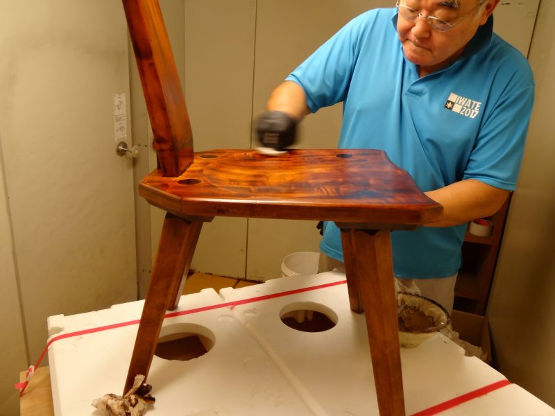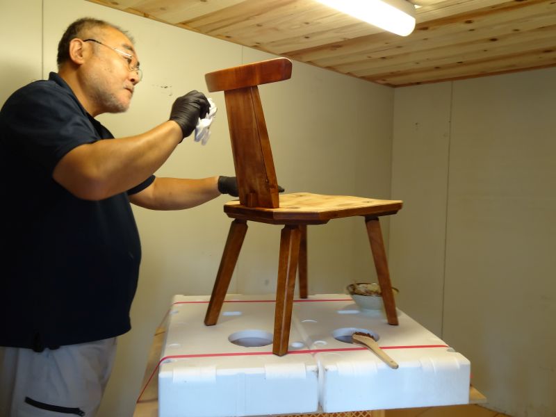 漆塗り1回目は磨いた椅子に木固めを塗布しました。この段階は傍で見ても良いとの事で全工程を写真で写しました。塗る椅子本体を回せる仕組みで塗っては拭き取りながら何度も繰り返していました。之だけでも綺麗に輝き始めるのですが、湿度管理しながら様子を見て、更にまた漆塗りを繰り返すのだそうです。まずは木固め1回目はここまでです。