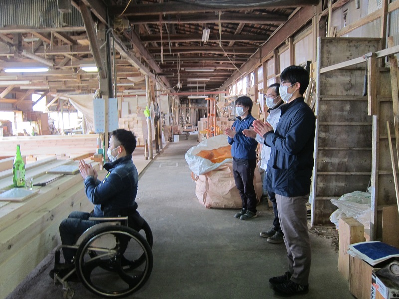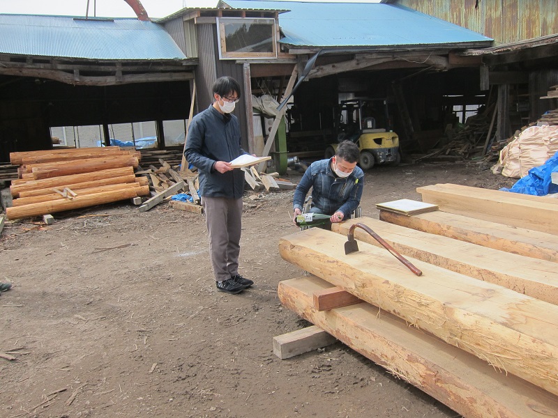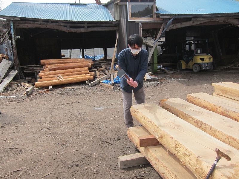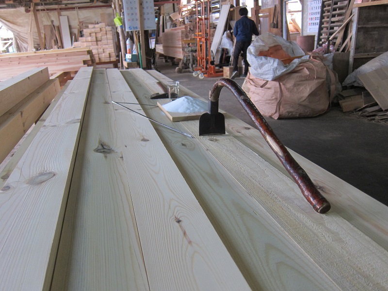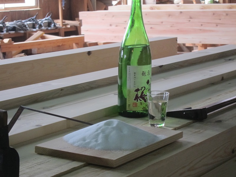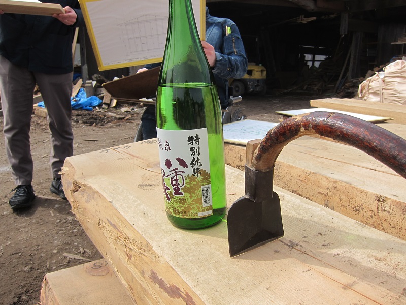 土曜日、岩泉町での新築工事の木材の清め及びチョウナ立式を行わせて頂きました。墨付け大工がお神酒でお施主様が塩で新築住宅に使用する構造木材を清めながら、使用場所と樹種を説明しながら、出所もお伝えする生きとし生けるものへの感謝の気持ちを施主施工者共に崇める意義ある儀式です。今回の建設地は岩泉町なので、木材は岩泉町の製材所からの納品材で、県産材及び町産材です。清めのお神酒も岩泉町泉金酒造の龍泉八重桜でした。清めてから後、初の刃物を入れ込むのがお施主様との尊い行いをしていただきました。