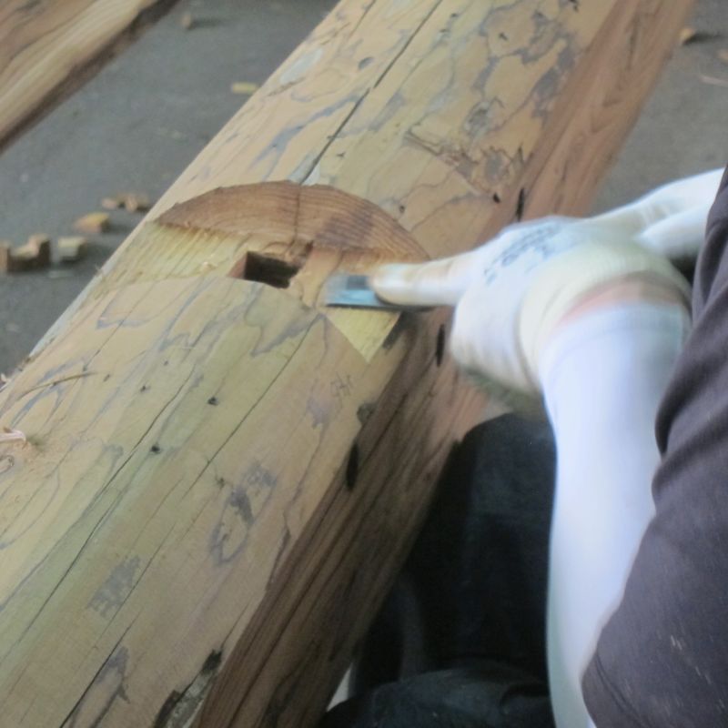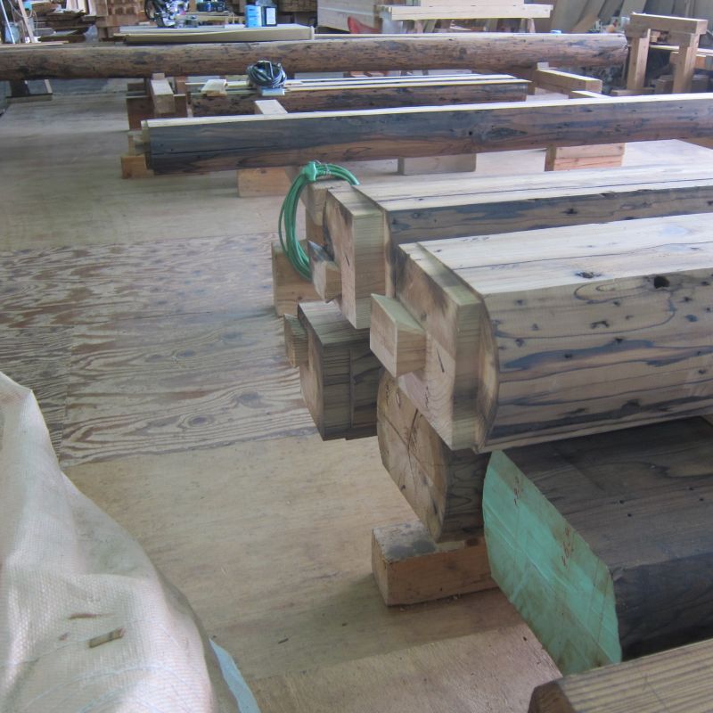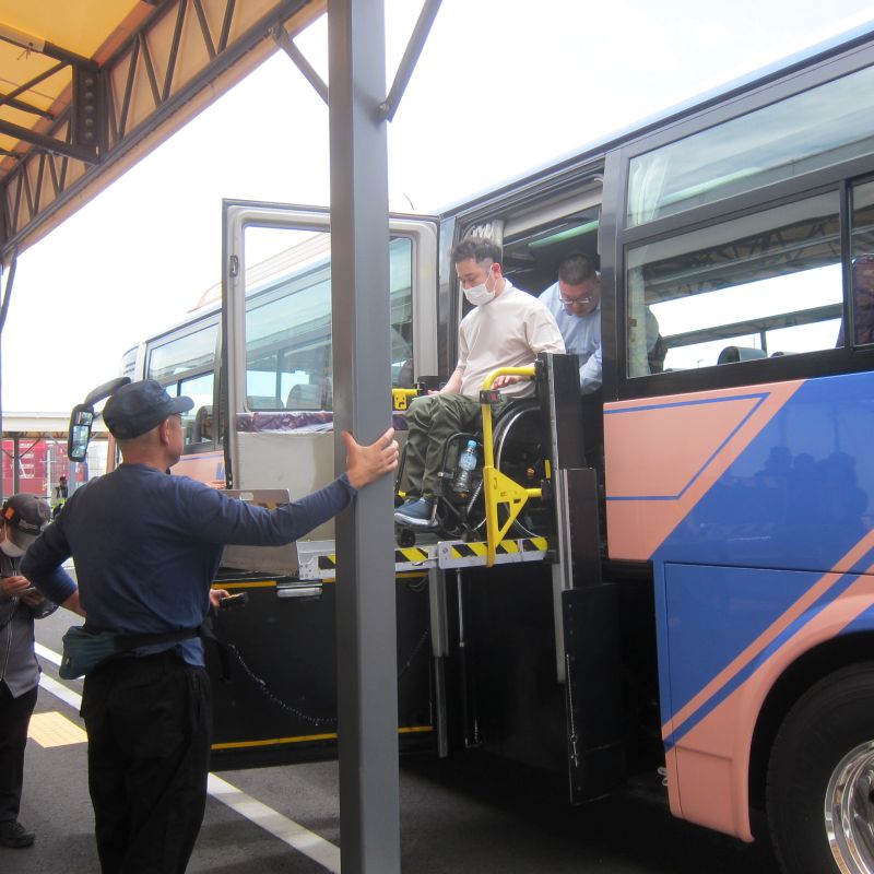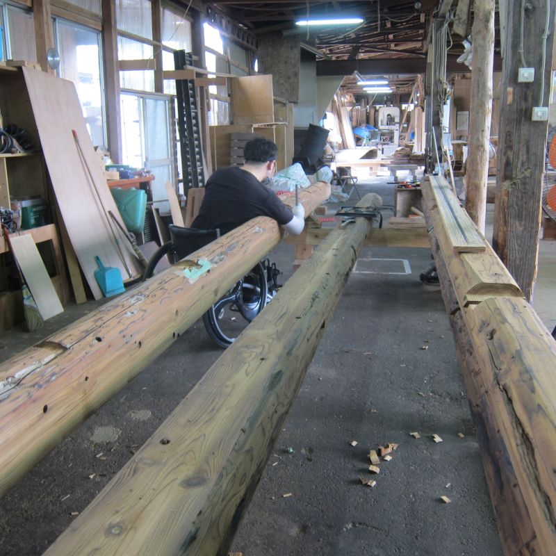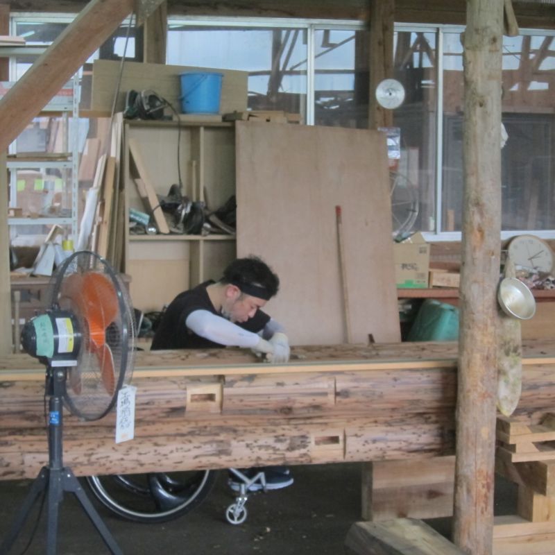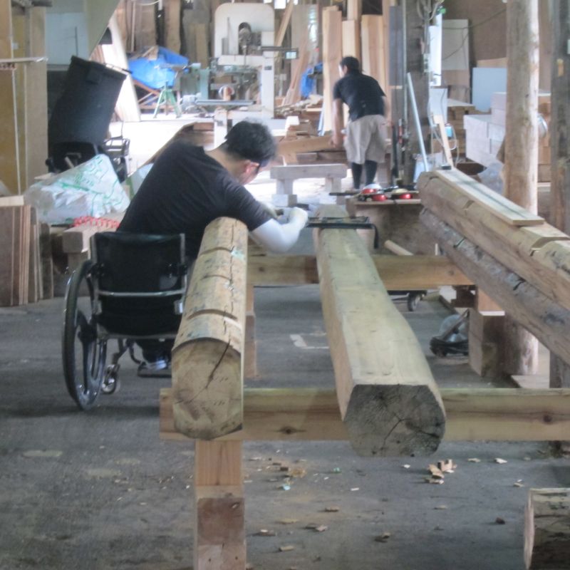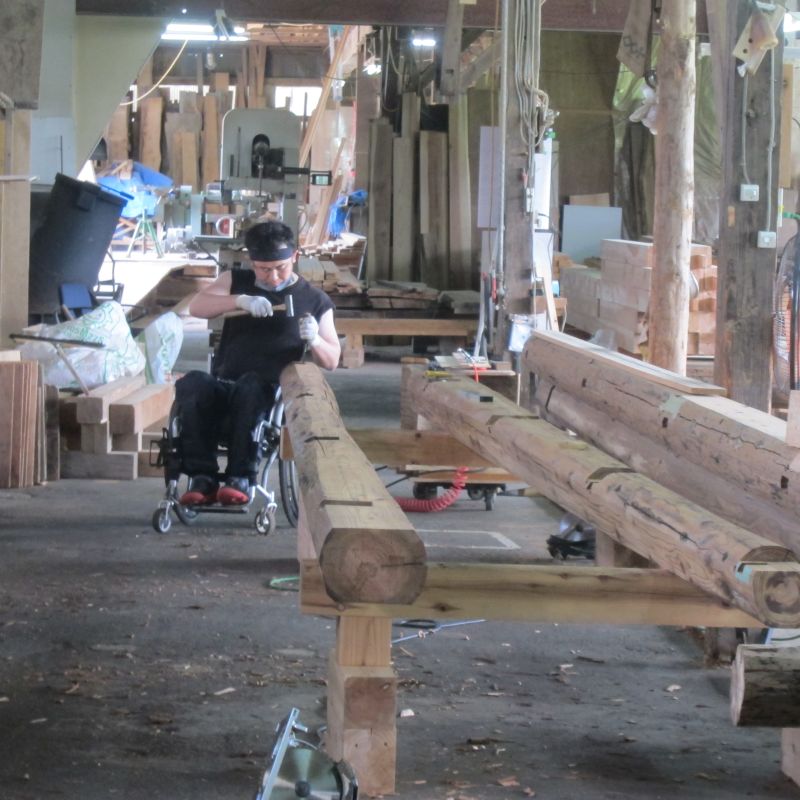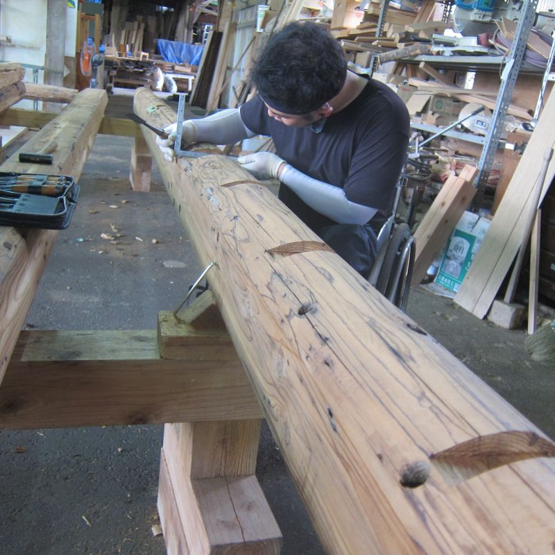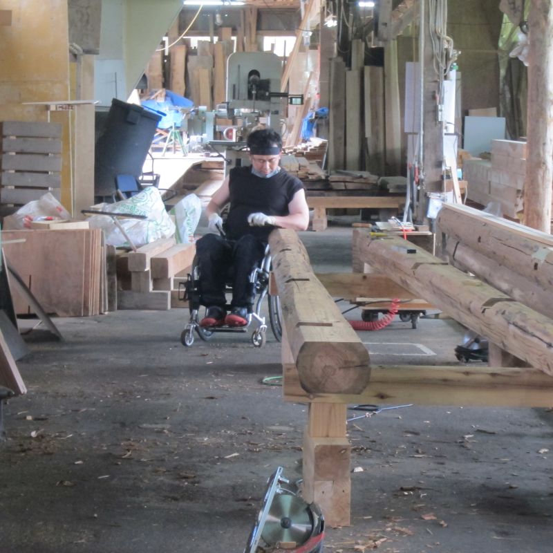 社員旅行中の移動はバスチャーターでしたが、全自動リフトの優れモノでした。その車椅子大工は、戻ってまた電柱車庫の手刻みしています。ほんとうによく頑張りますよね。