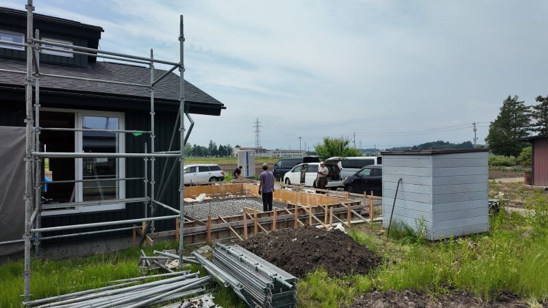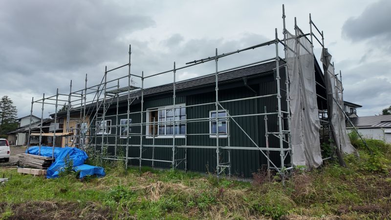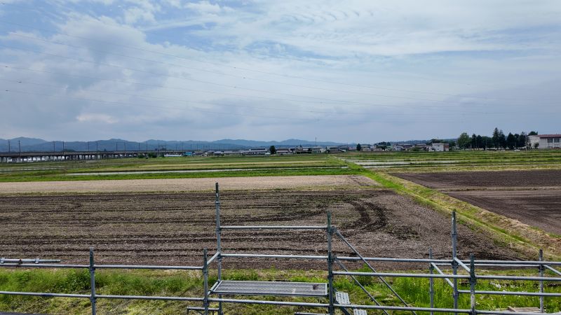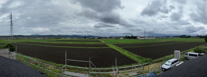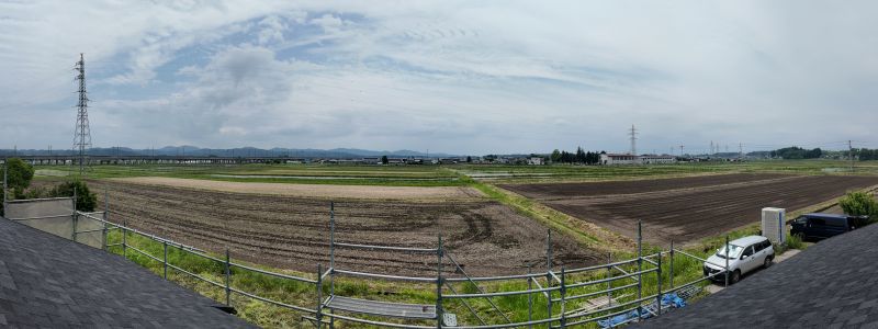 現在新築工事中の北上の新築住宅の足場に上がって眺めた景色が豪快です。来週からは車庫の建て方も始まります。