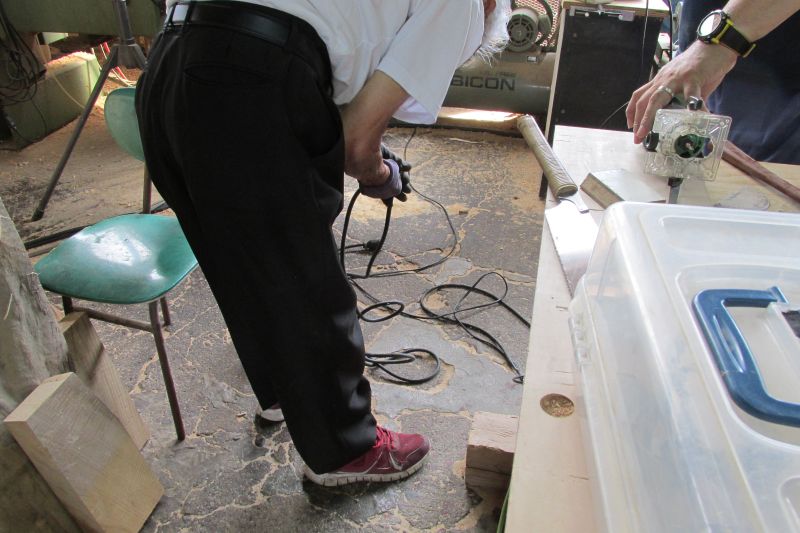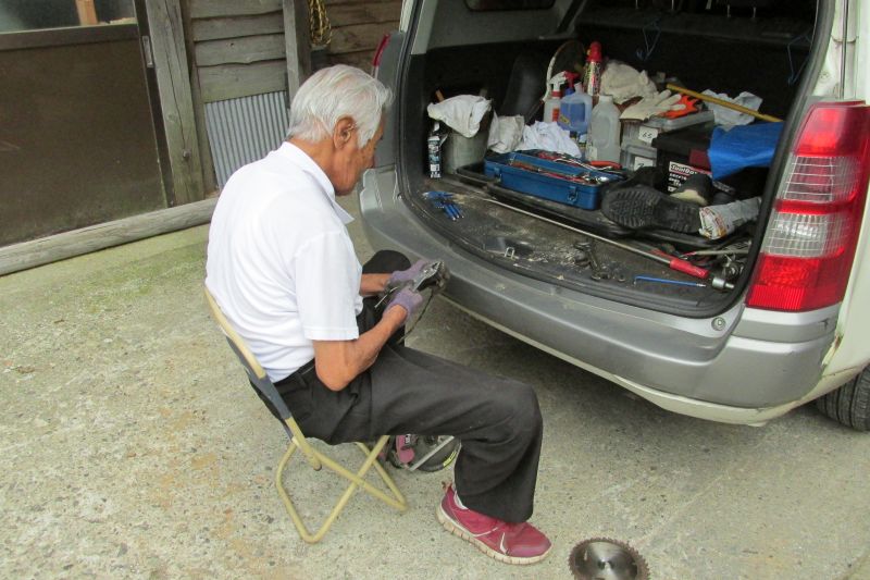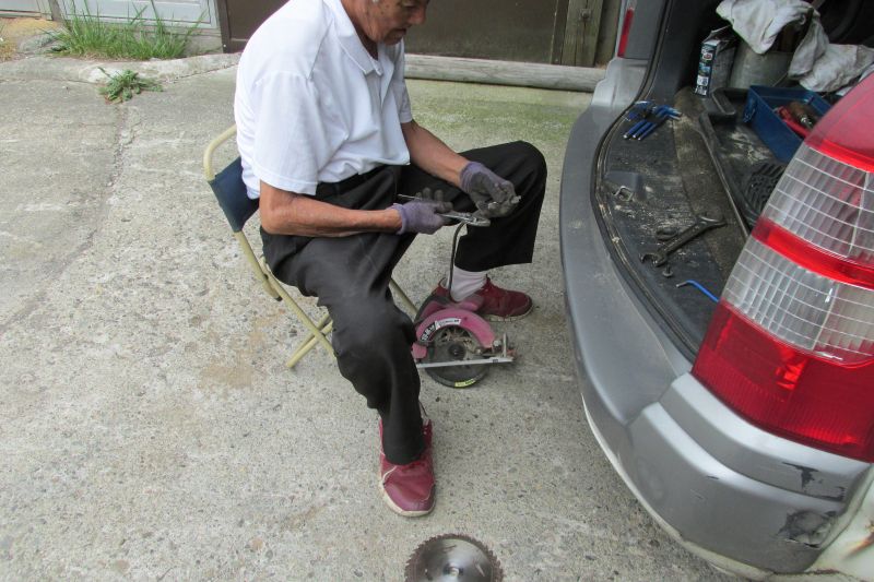 いつも機械修理してくれるオオエの親父さんです。壊れた電動工具の電線も捨てずに利用するのです。ほんとに凄い方です。見習わないといけませんね・・・