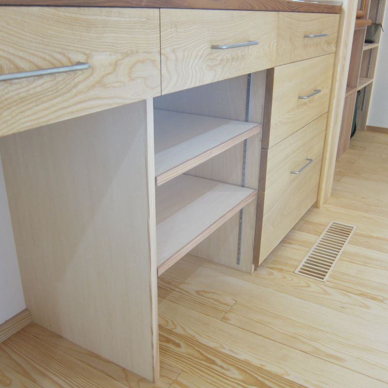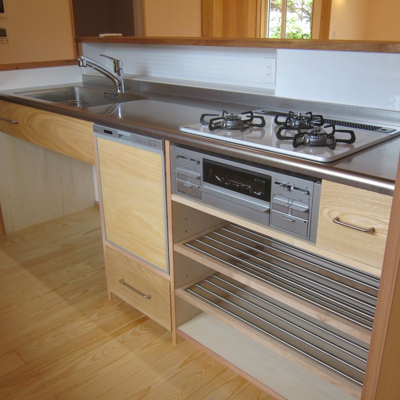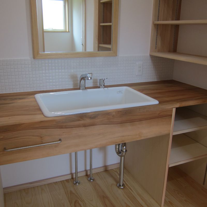 先週竣工お引き渡しさせていただきました、みたけの大改修現場の特筆事項を書かせていただきます。改修前の縁側の床板を丁寧に外して、鉋を掛け直すととても綺麗な杢目の栓の木でした。その一枚板は引き出しの前板として蘇りました。写真1枚目がその縁側で、写真二枚目が流しダ台バックカウンターの引き出し前板です。杢目の流れが揃うように配置されています。写真三枚目からは造り付の洗面台にガス乾燥機置き場などです。乾燥機の下棚は引き出して乾いた衣類を畳んで仕分けることが出来る引き出し板が造作されています。