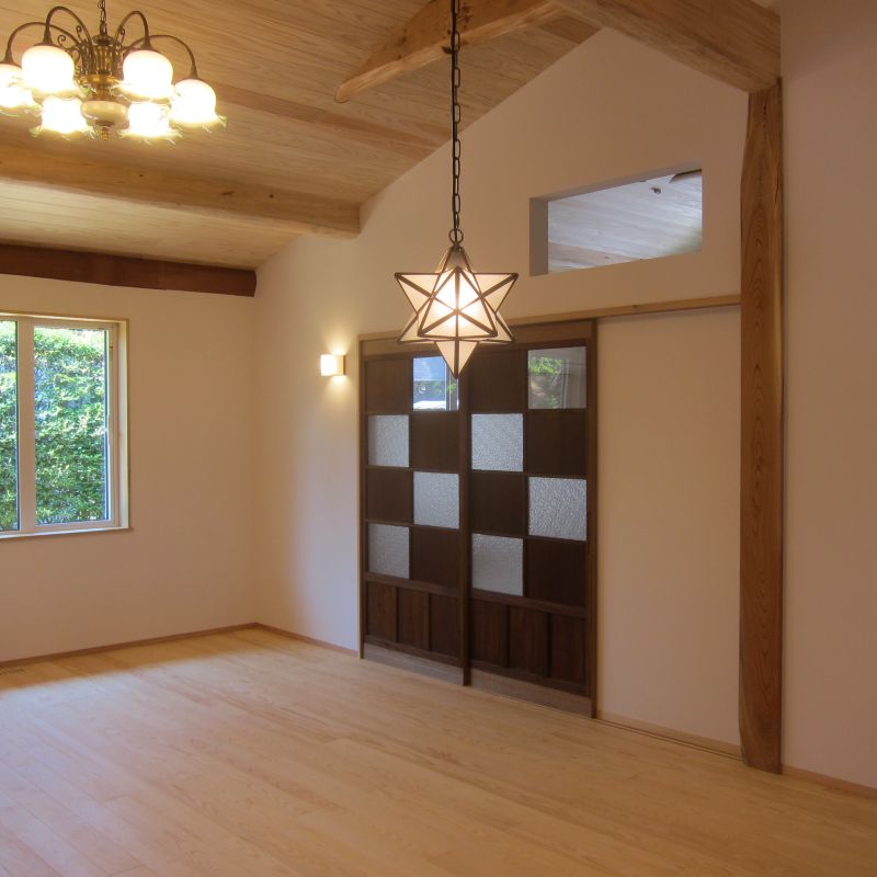 当社手持ちの古建具に板をはめて市松模様にしました。お手本は桂離宮です。