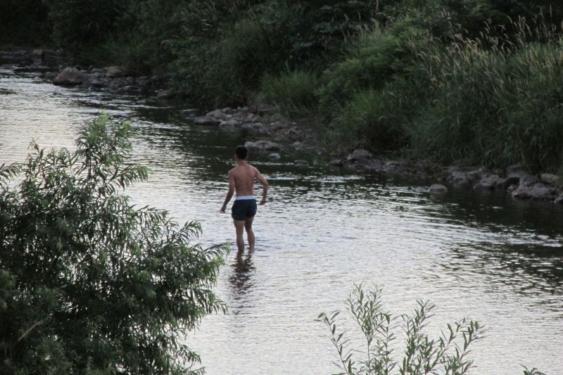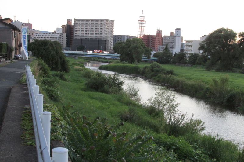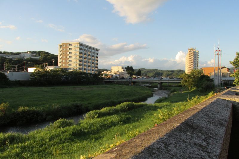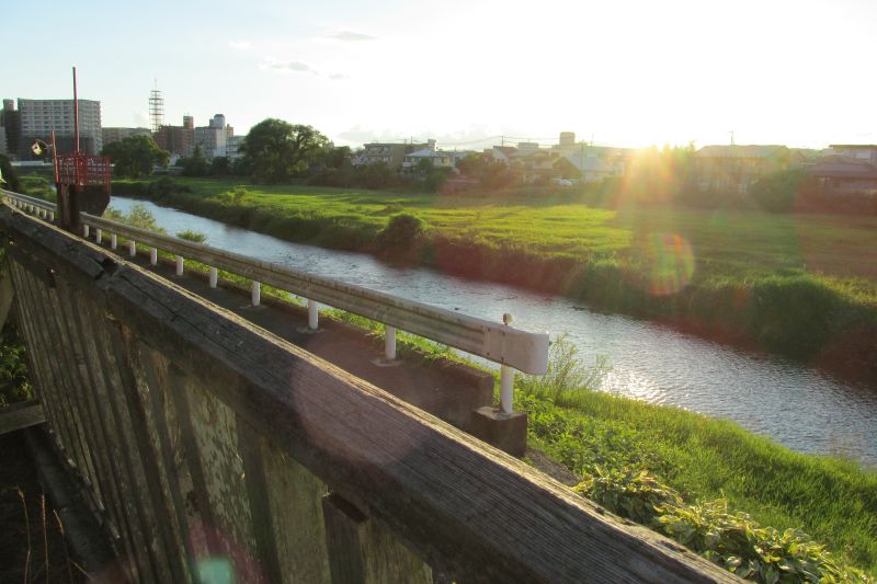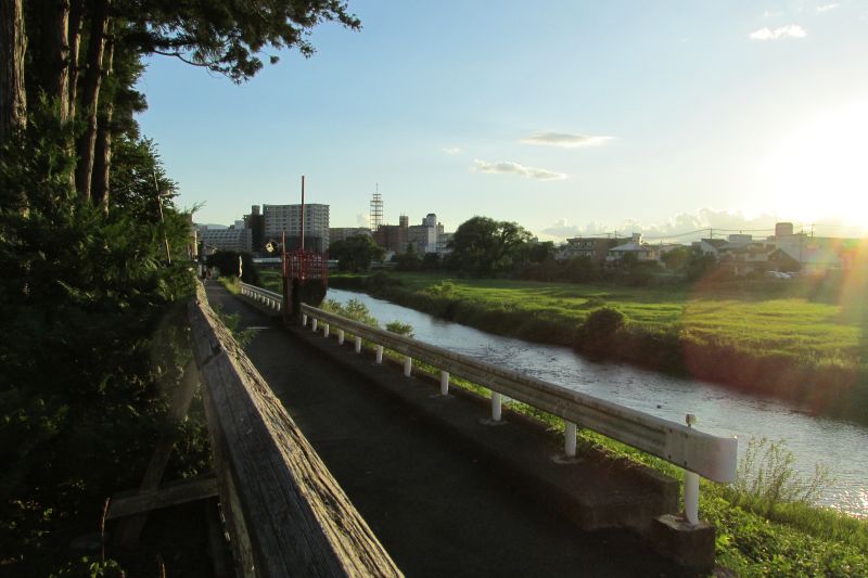 川留め神社の裏に回ると中津川の流れが美しく見えます。岩手山山頂には日本列島のような雲も見えて、川では近所の子らしき子供たちが川遊びしていました。