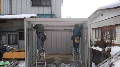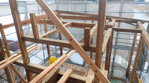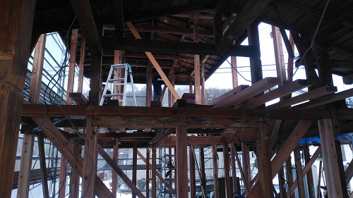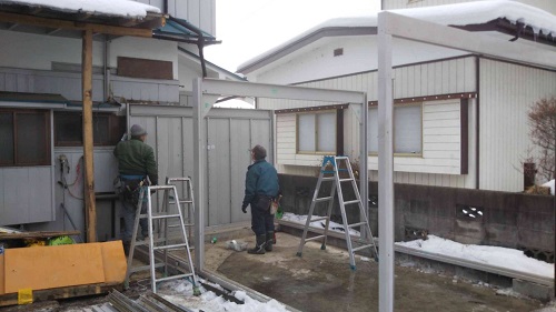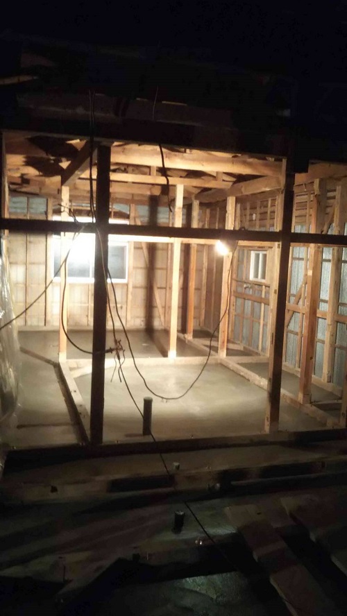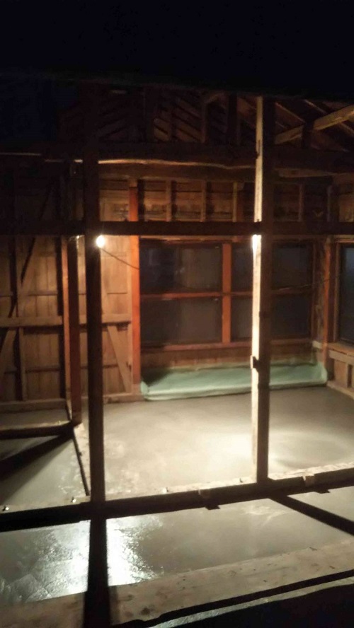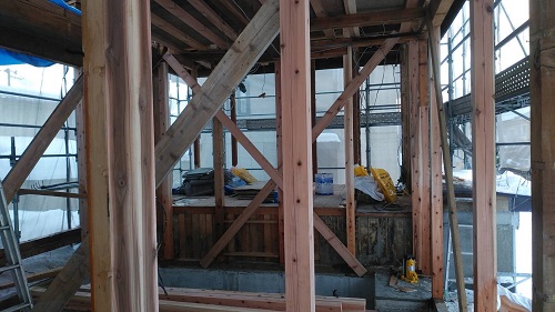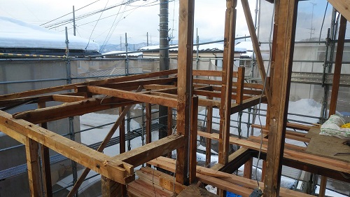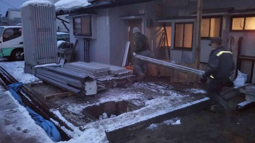 腐食した柱の取替えや下水配管に土間基礎工事も進みましたが、やはり外は凄い雪です。