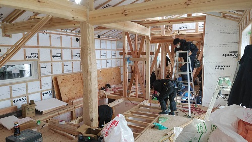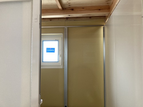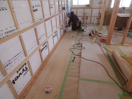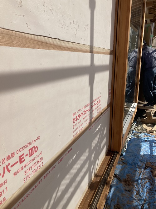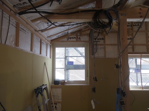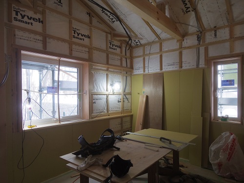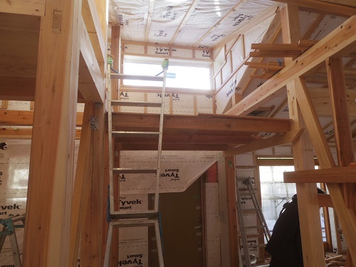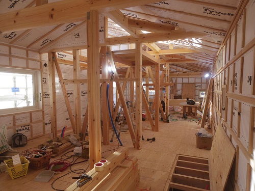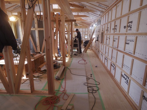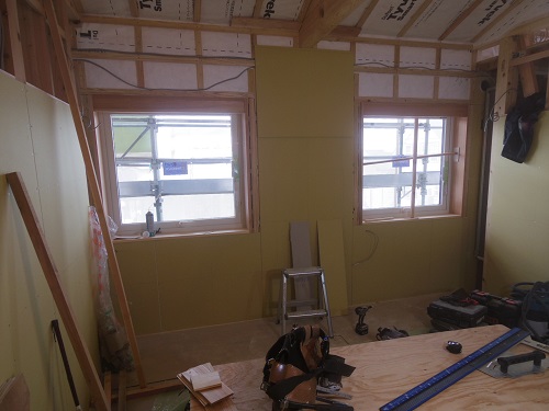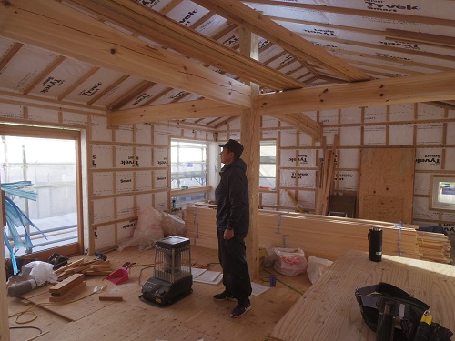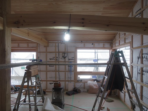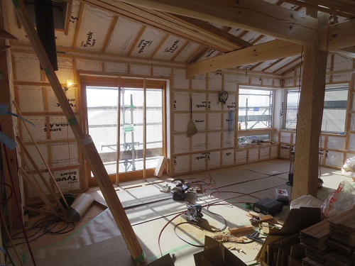 諸事情あって、煙突設置場所の移動を行いました。内部断熱も進み200mmの壁断熱が出来上がり、防湿シートの張込みも進んでいます。