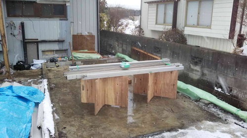土間基礎新設の段取りに入りましたが、除雪作業の方に手間を取られています。