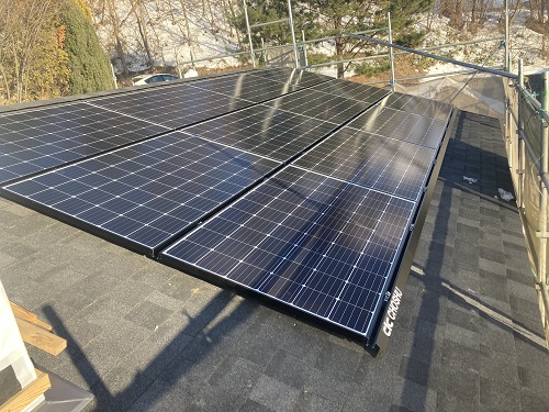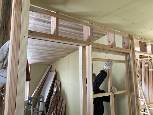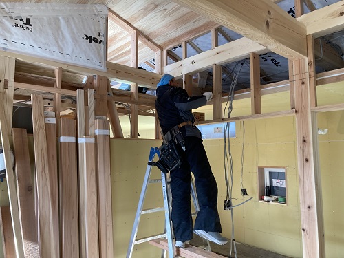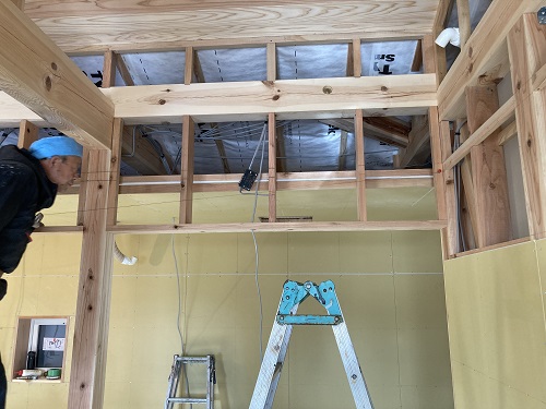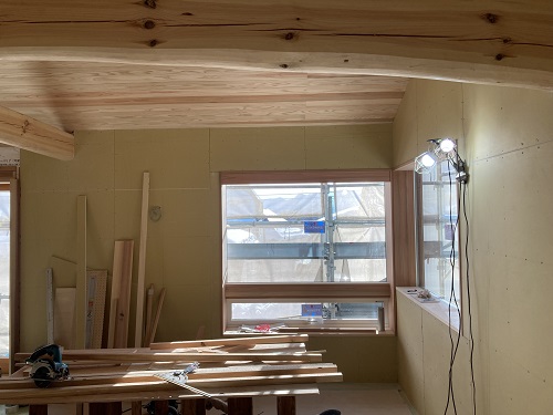 太陽光発電パネルを載せる為に屋根の雪降ろしを行いました。内部は引き続きのボード張りと斜め天井杉板張りが進みました。