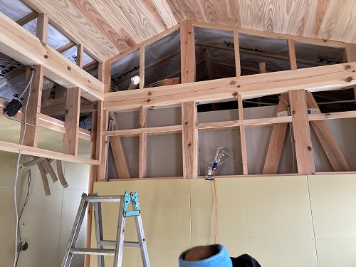 電気配線が進んだので、斜め天井の杉板張りも進んでいます。