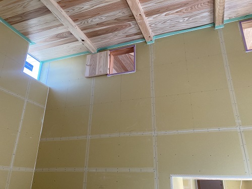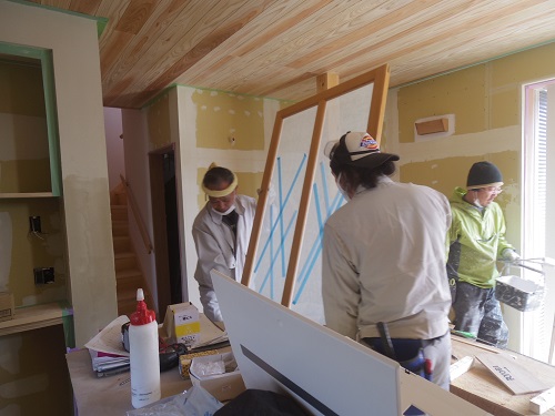 大工が集中して仕事に取り組んでいます。外部は足場が外されて車庫の断熱工事が進められて内部は内装のパテ打ちが始まりました。大工造作共に勢い良く進められています。