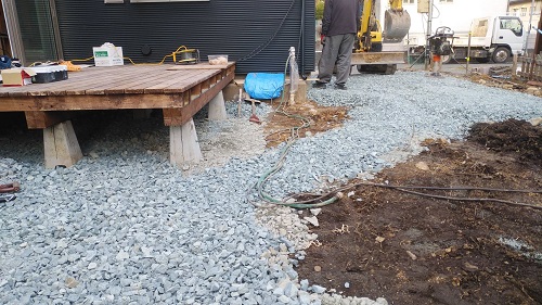 1階の大工造作も大方で内装も1階に降りてきました。ウットデッキ工事も進みました。外土間のd説準備も完了です。