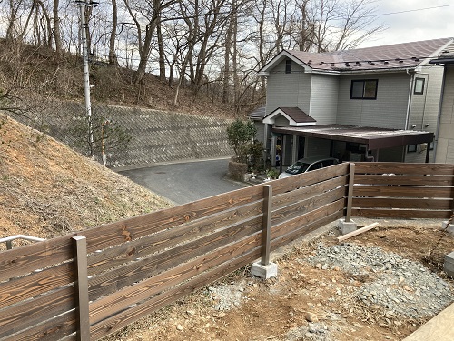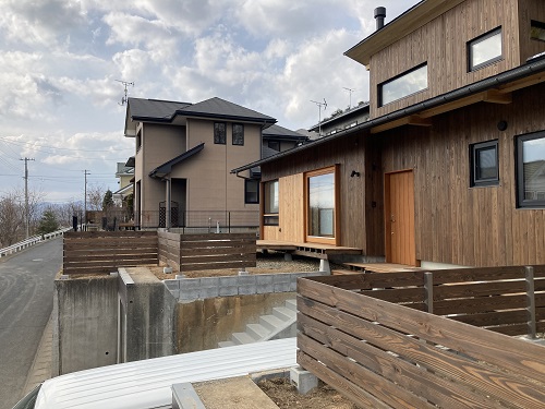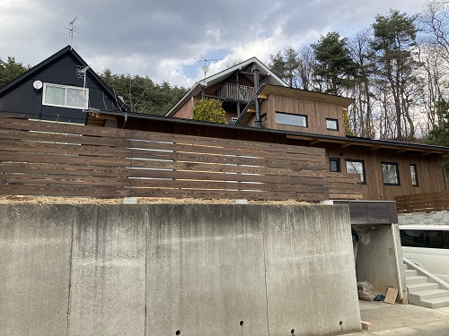 外部フェンス工事が完了して来ました。外壁に合わせて落葉松の無垢板を取り付けています。