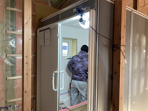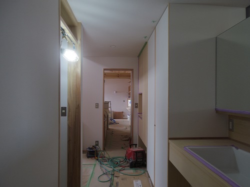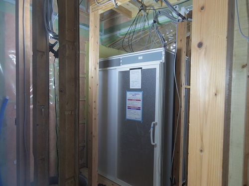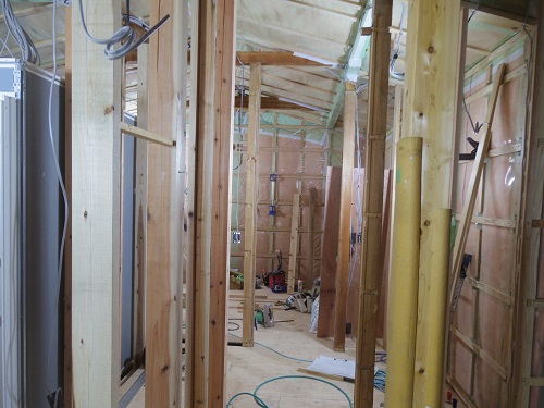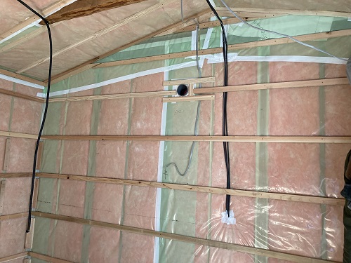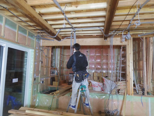 ユニットバス設置も完了し、内部は防湿工事が進み各種下地の取り付けも完了し、やっと電気配線工事が出来てきました。外部は外壁の先付け板金工事がkン領したので、外壁張込みが始まります。