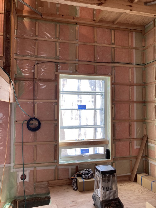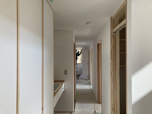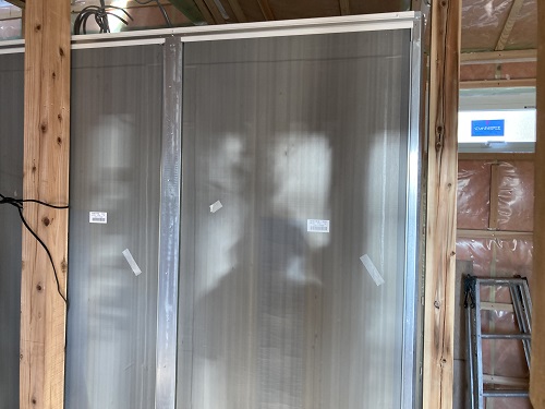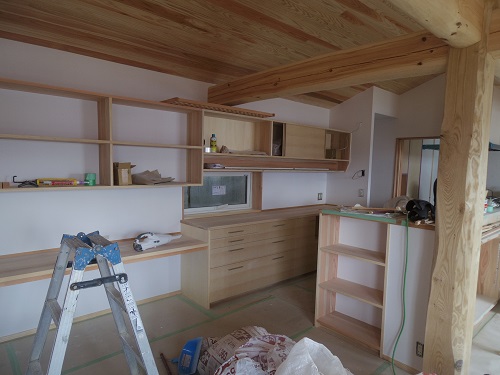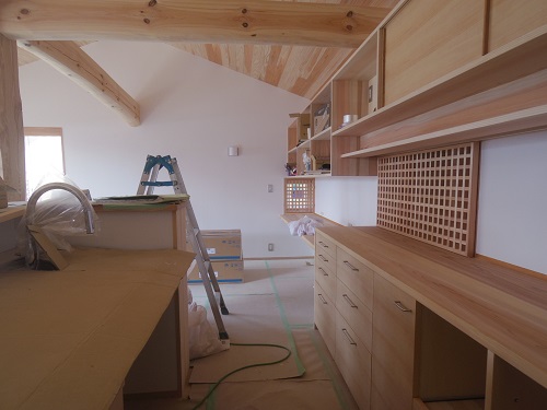 外壁が進み、内装と大工造作は大方で、建具の吊り込みも進みました。