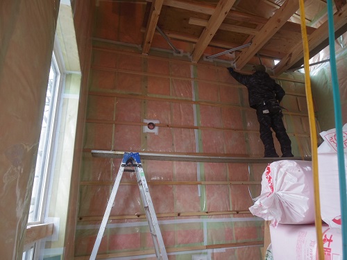 外壁工事が進み、電気配線が行われたので、ボードの張込みも進みました。