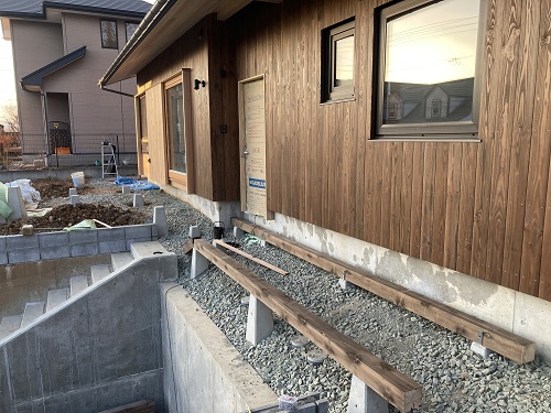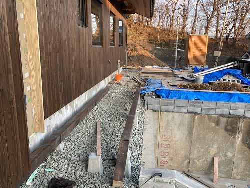 外部工事は、玄関前ポーチとウッドデッキ工事が進みました。