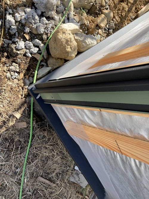 外部は、もう少し後一面で張り上がるところです。引き続き破風板金と雨樋の取り付け工事が進む予定です。内部は外皮側のボード張込みが進みました。