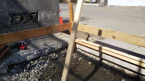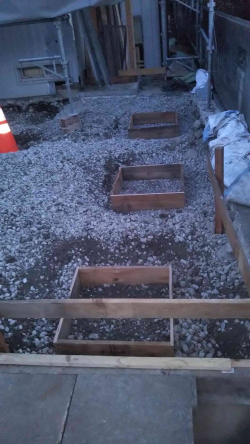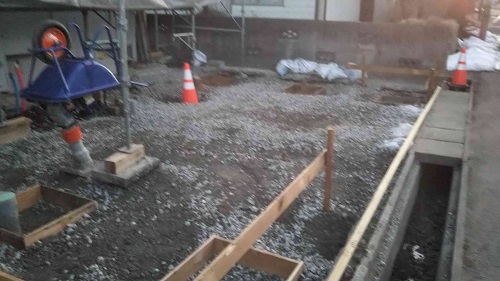 既存の外部土間をハツリ撤去したので、新たな水道配管の引き込みと土間面の整地が進みました。