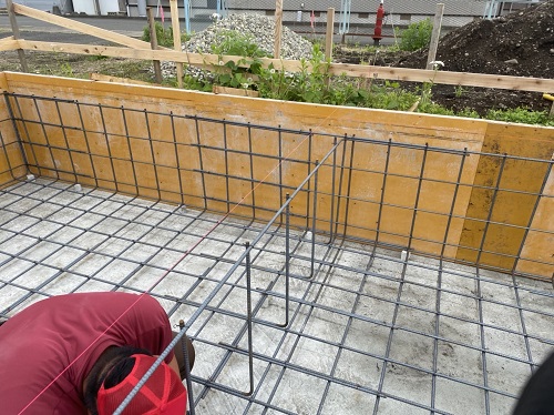 基礎工事は配筋を終えて基礎枠の取り付けを進めています。