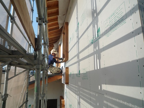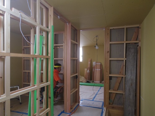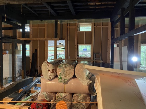 内断熱の充填工事も進みました。この部分は、古来からの技術と現代の技術の融合を成すところとなります。