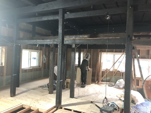 床下の水道配管が進んで、下地合板の張込みも進めて、古材梁の補強入れ替えなども進んでいます。