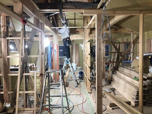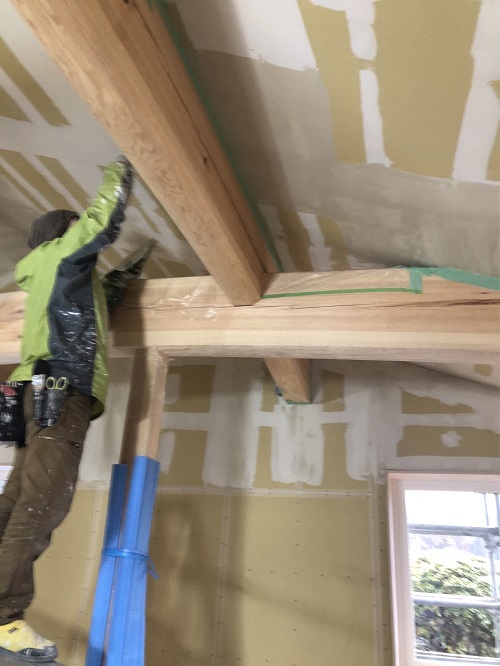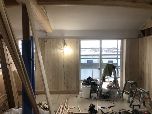 天井の一部が塗りあがる中、大工内外工事も進みました。