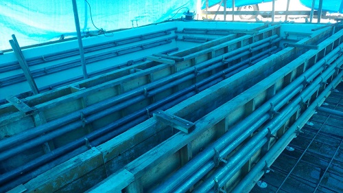 基礎をすっぽりと包み込む養生を取り付けたシート屋根の下で川の固めを入念に行ってコンクリート打設準備が整いました。