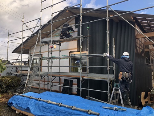 大工が入り乱れますが、間仕切り壁工事を進めます。外壁も進んでいます。